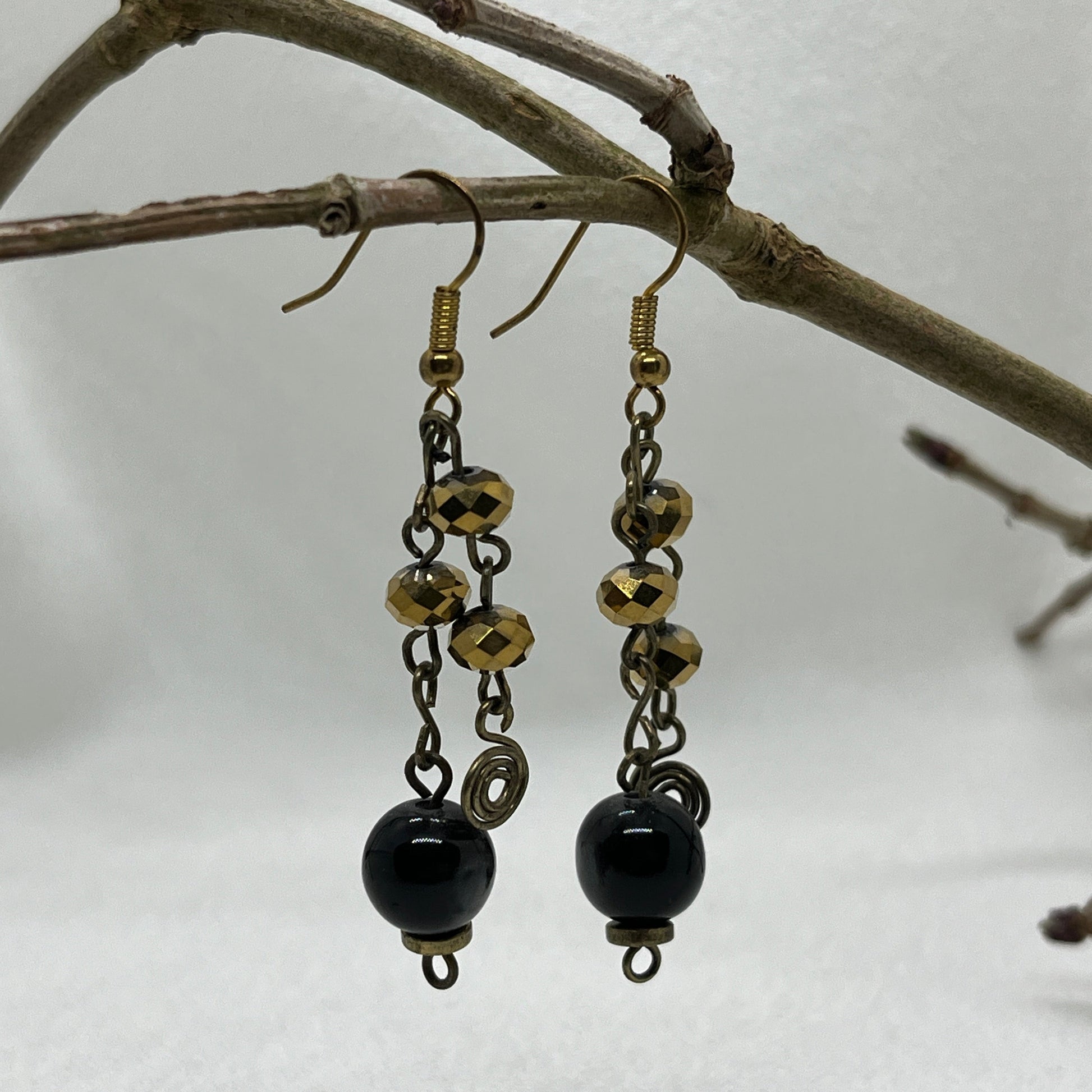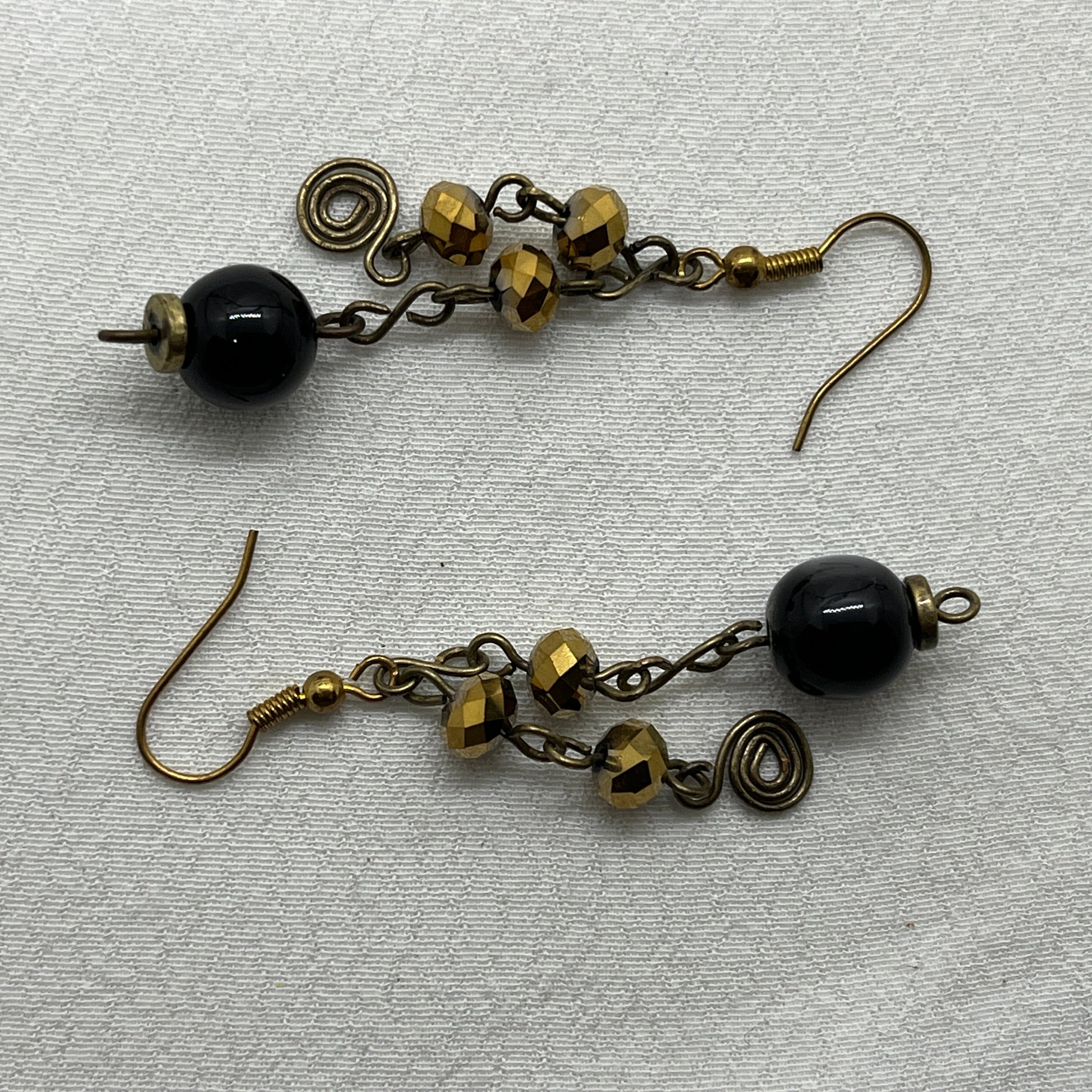 Messing ørering med vedhæng af facetteret guld metal perle der afsluttes med en messing swirvel og en smuk sort cateye sten.