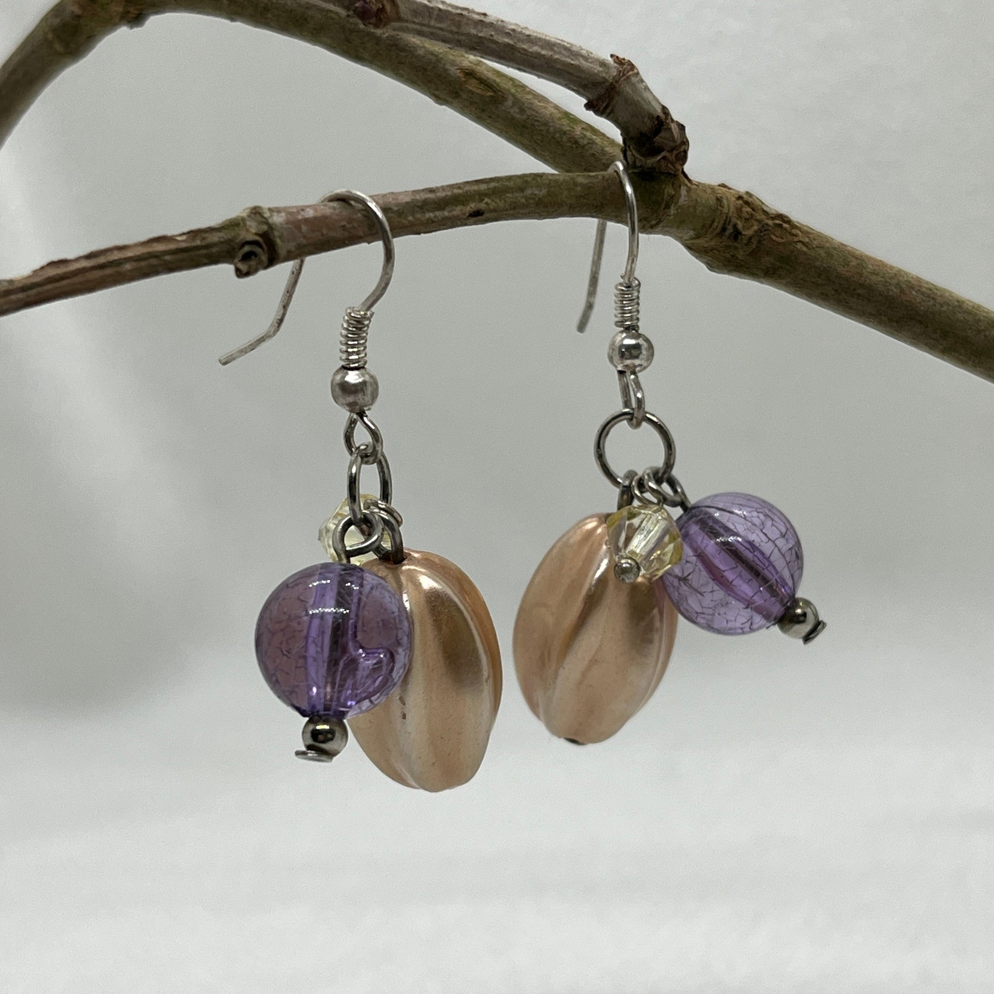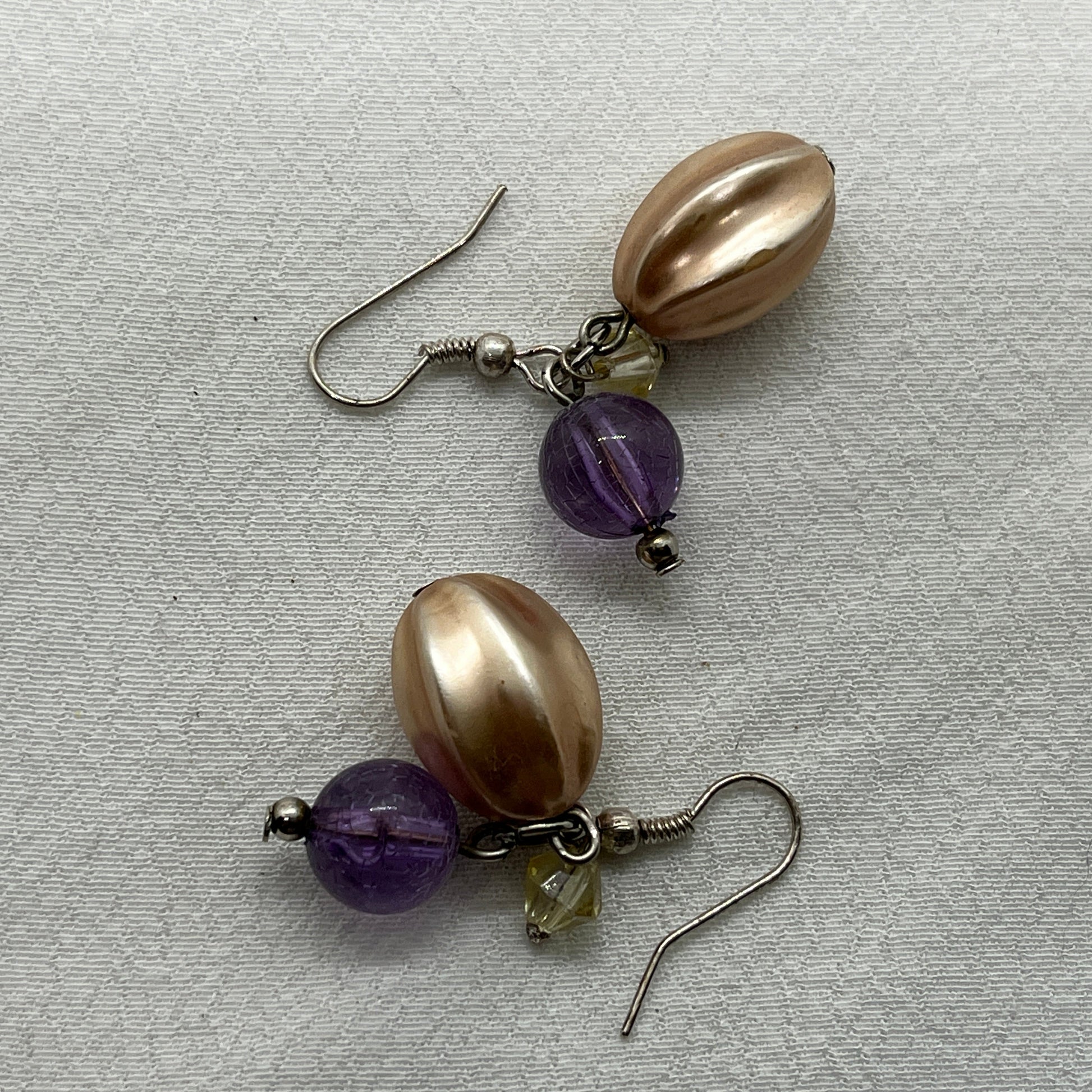 Fin sølvørering med 3 vedhæng bestående af: en stor spiralsnoet rosa akryl perle, en lysegul cone i glas, og en smuk lyselilla glasperle med fine krakeleringer.