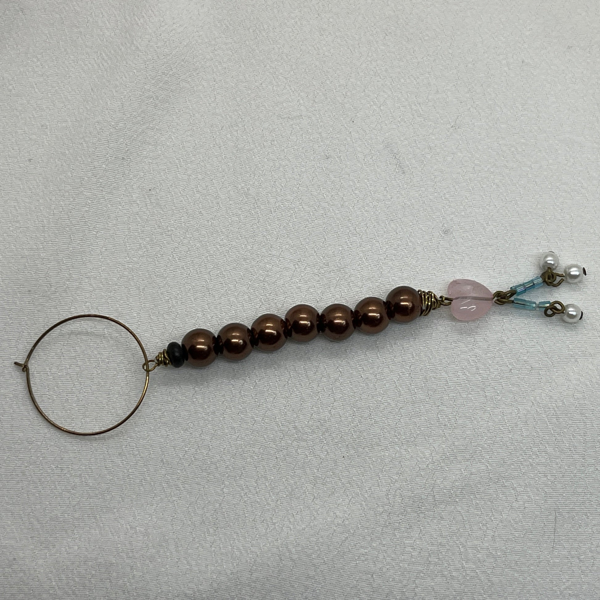 Single messing hoop med indfarvede brune Ferskvandsperler sat på en messingtråd. Den afsluttes så fint med et lille rosa akrylhjerte og igen i 3 små vedhæng med blå perler og små fine Ferskvandsperler.
