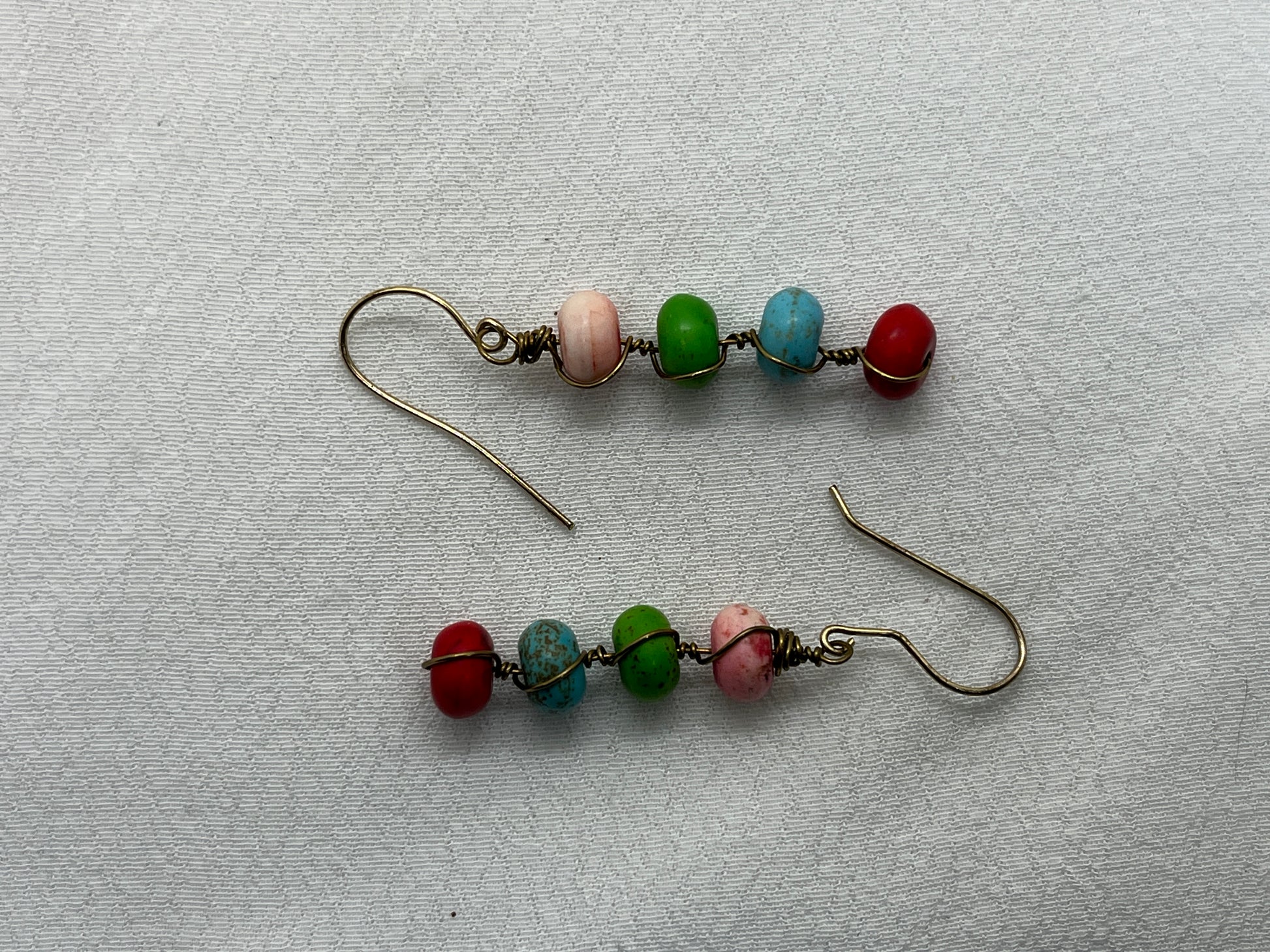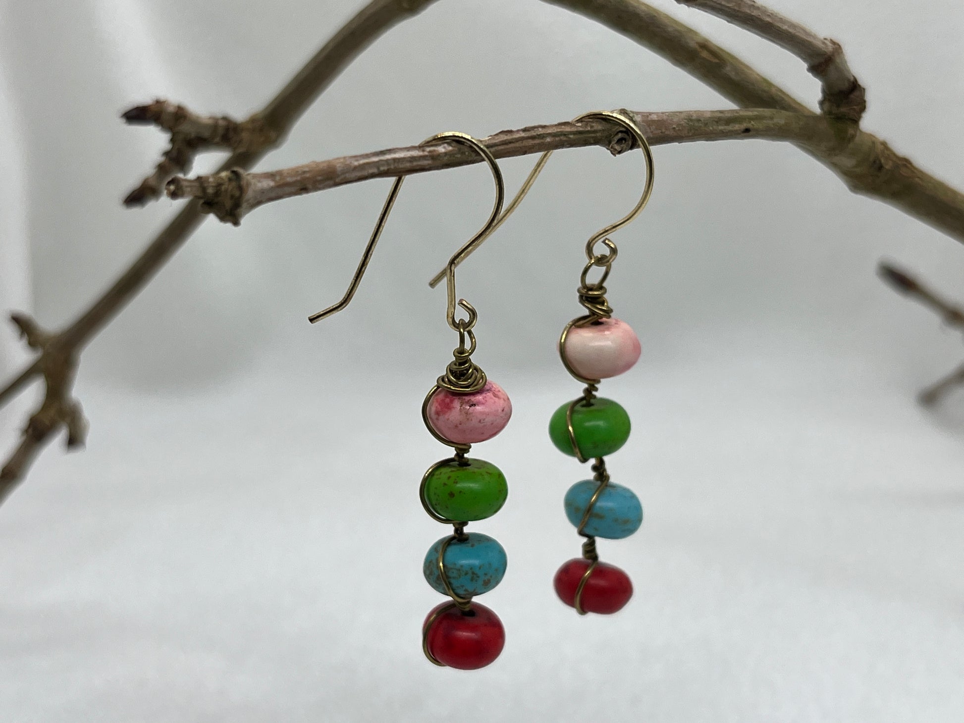 Øreringe i messing med 4 keramik perler på række viklet i messingtråd.