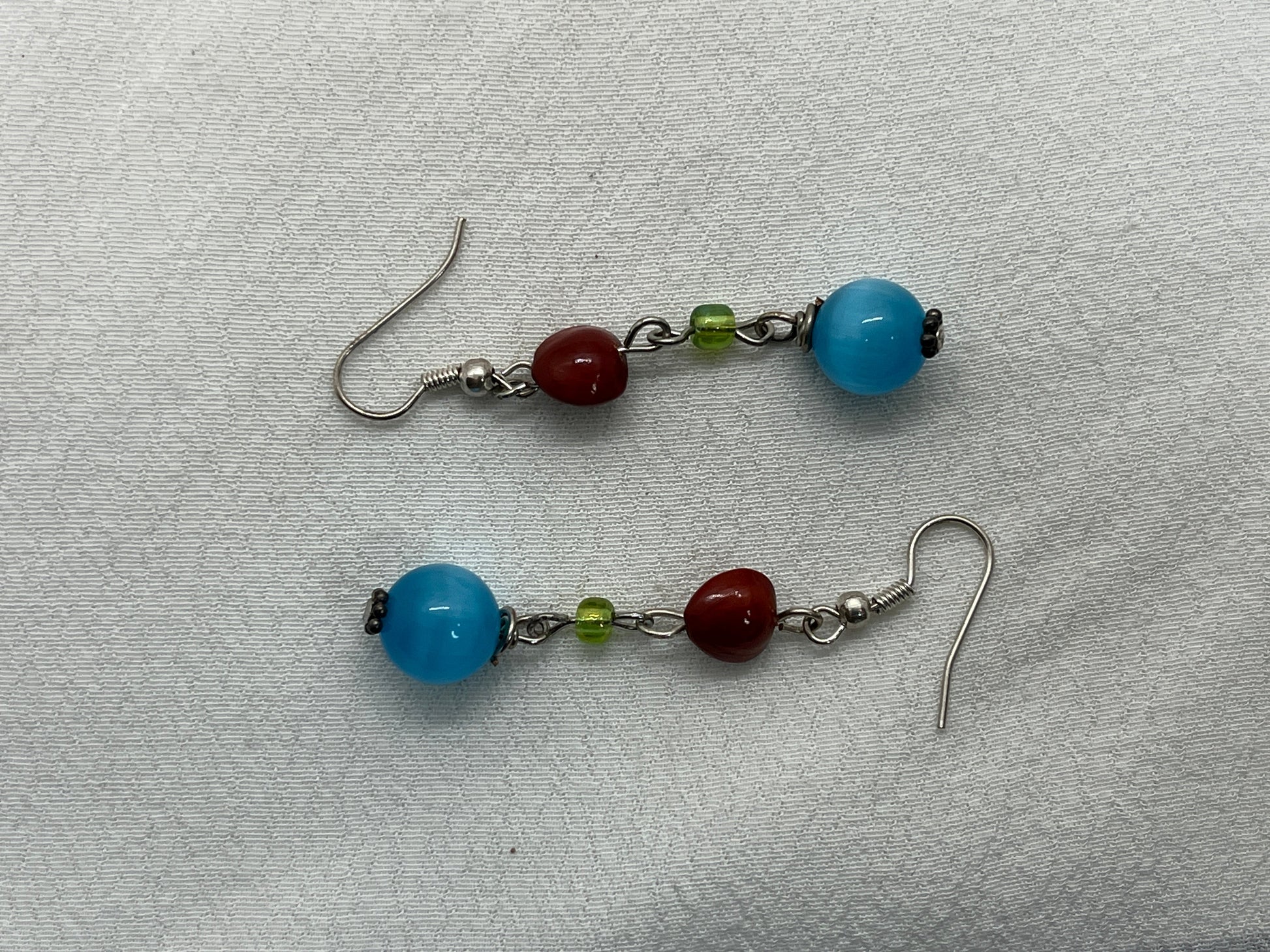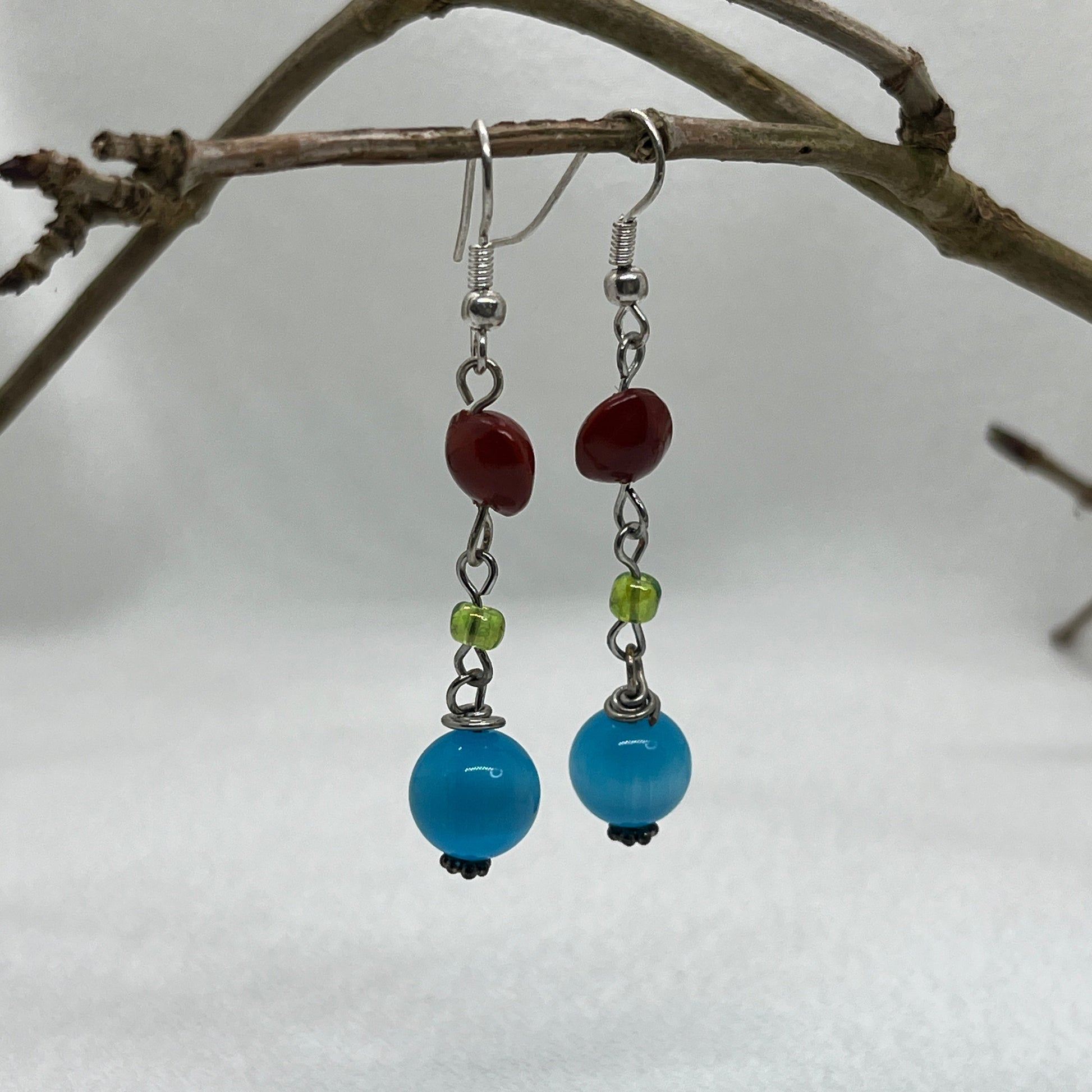 Øreringe i sølv med vedhæng af en rød frøstand, en grøn glasperle og afsluttet med en smuk blå Cateye perle.