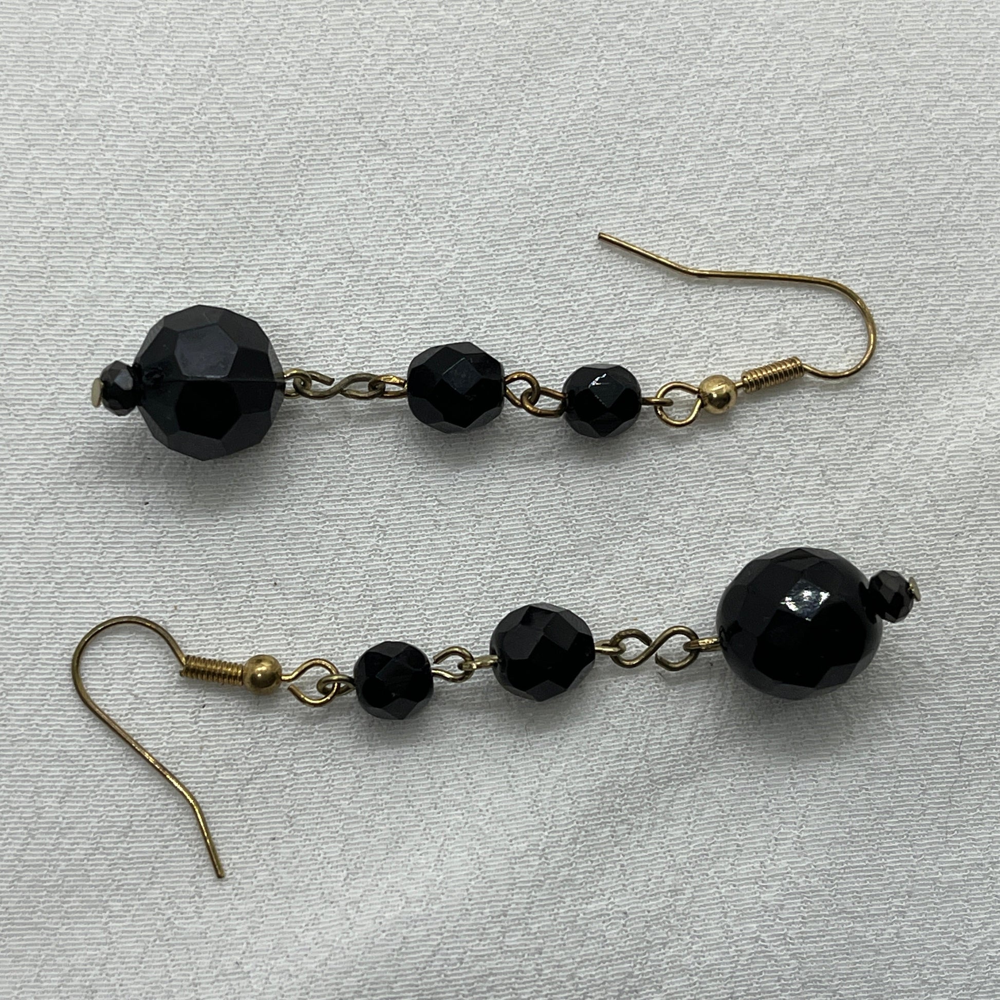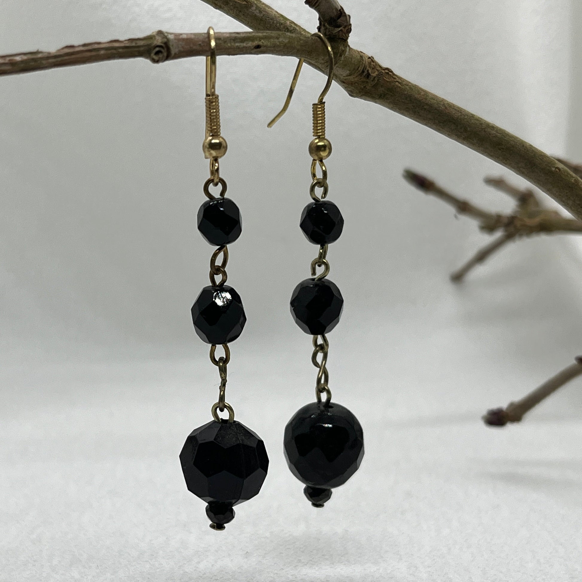 Messing ørering med vedhæng bestående af 4 facetterede sorte perler på messingtråd. Perlerne er en skøn blanding af sten og akryl.