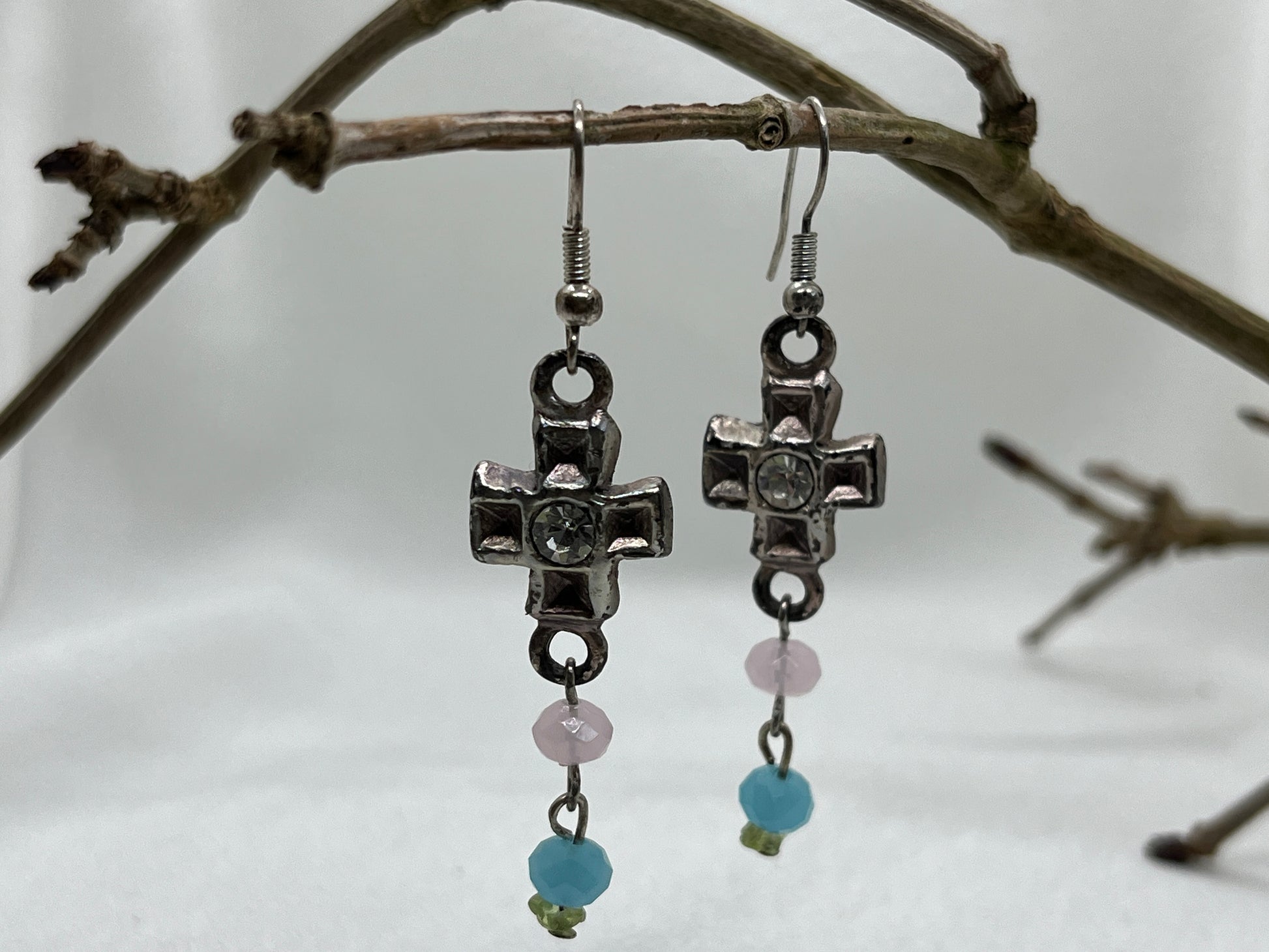 Øreringe i sølv med et fedt lille sølvkors hvor der er en similisten i midten, herefter er der vedhæng med lyseblå og lyserøde facetterede perler samt små grønne Aventuriner.