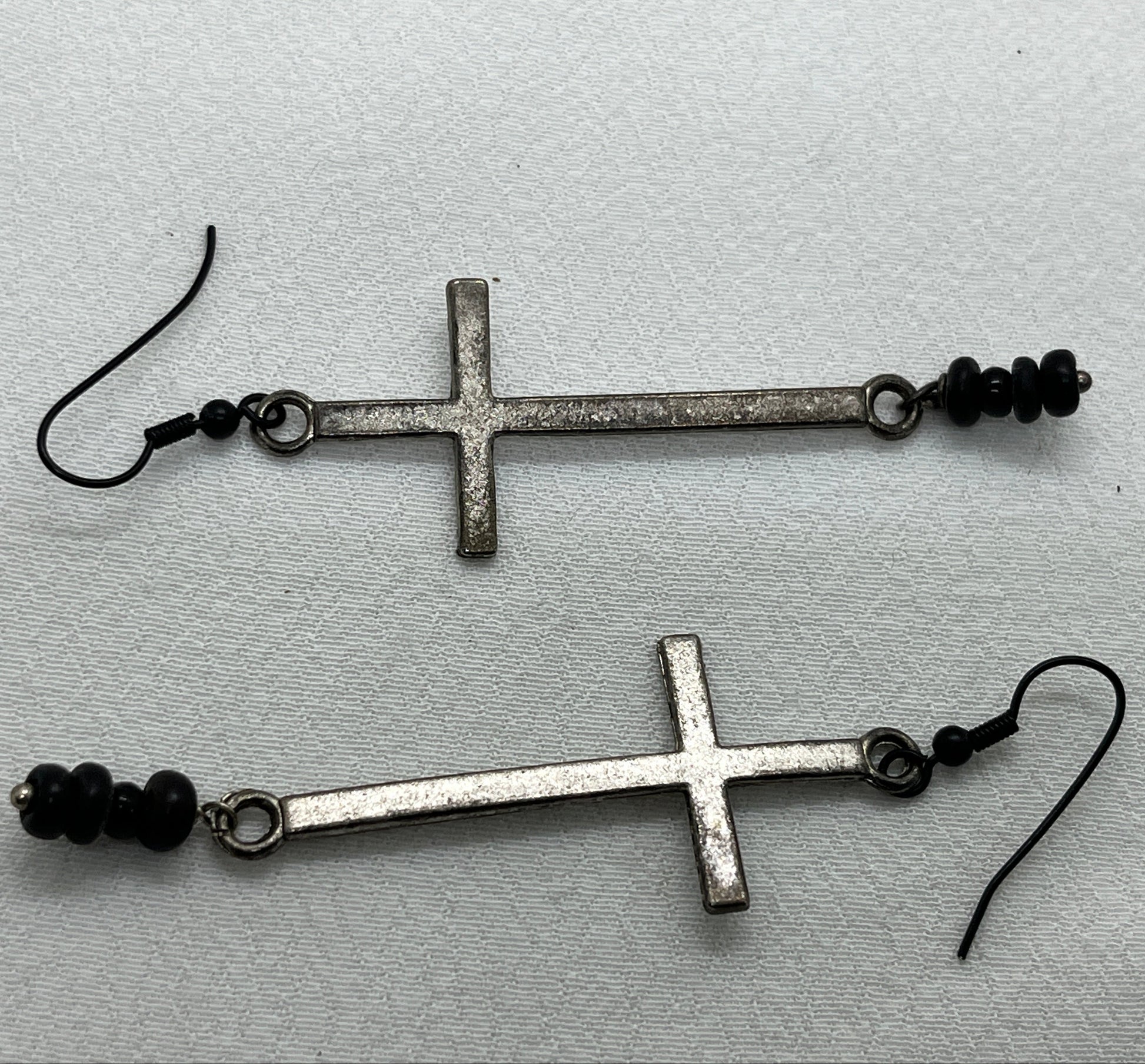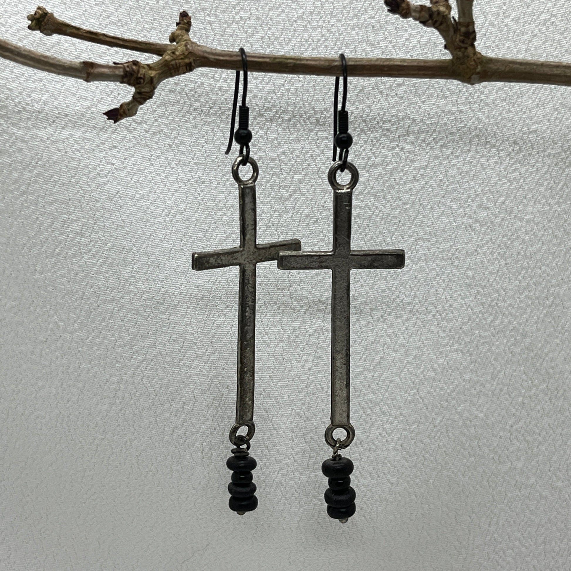 Øreringe i sort metal og med et tyndt langt sølv kors hvor der hænger sorte glas og træperler som afslutning.