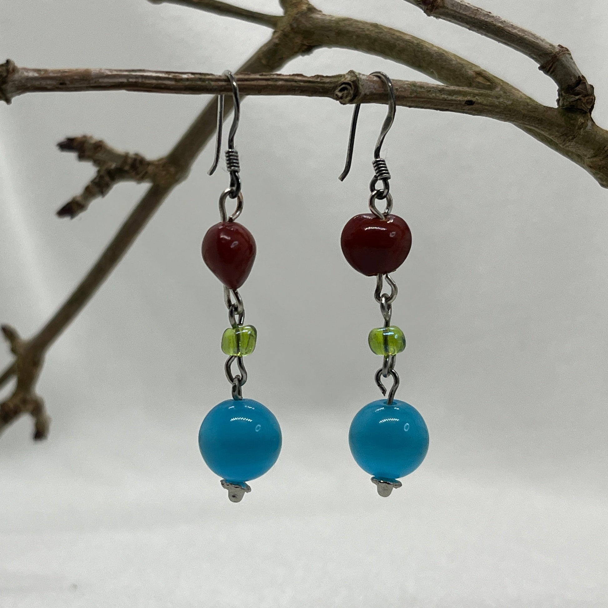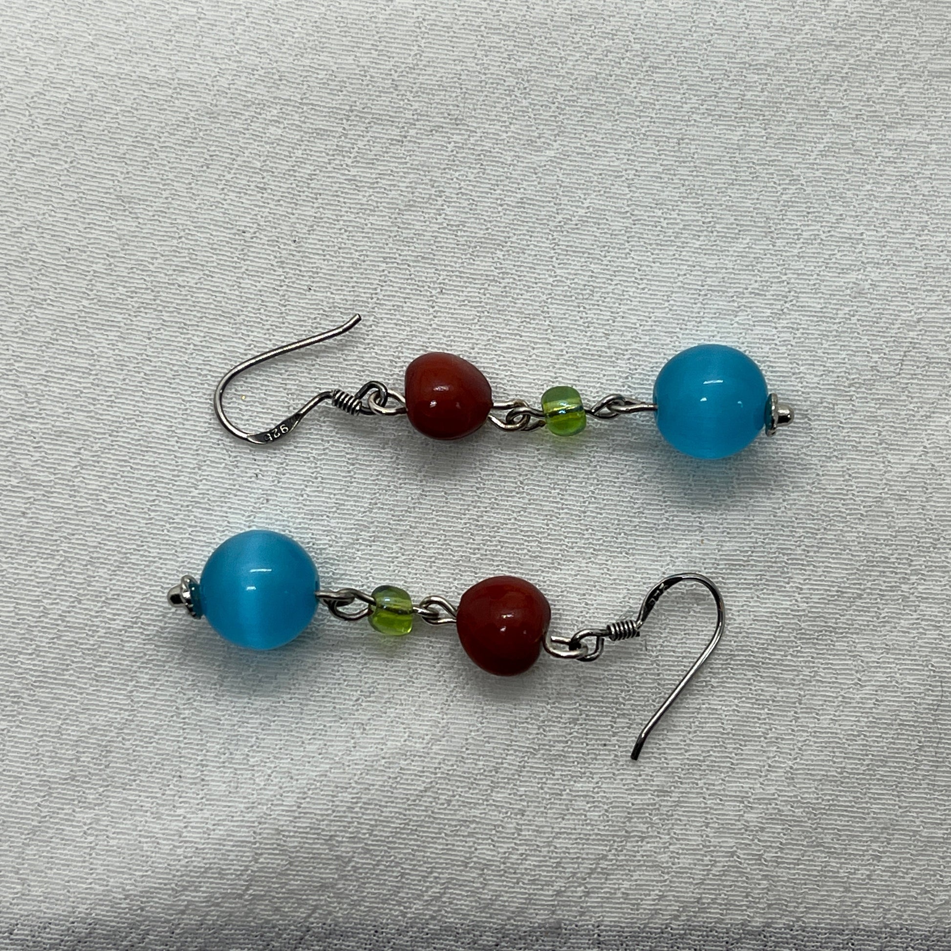 Øreringe i ægte sølv med rød frøstand, grøn glasperle og smuk blå Cateye sten.