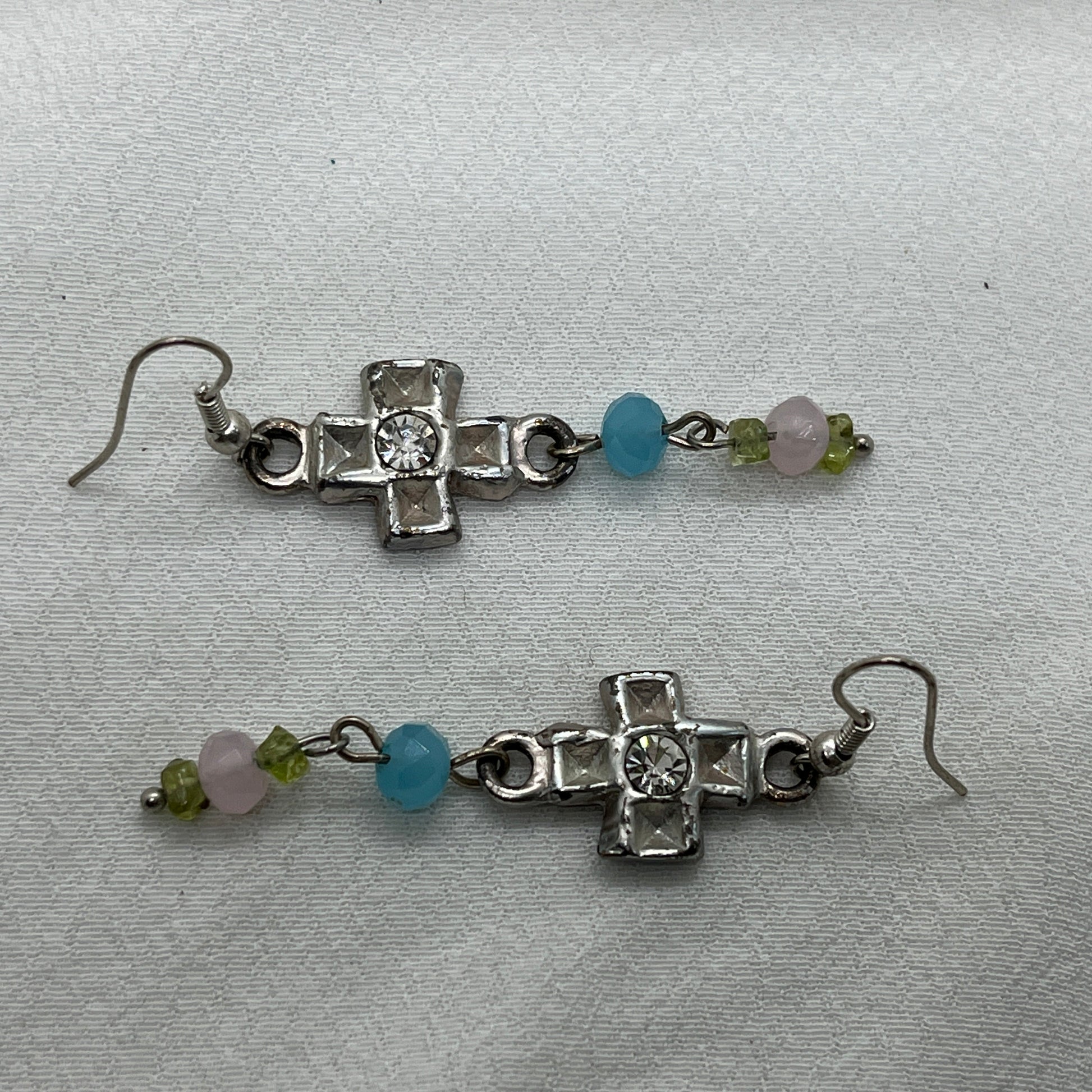 Øreringe i sølv med et fedt lille sølv kors hvor der er en similisten i midten, herefter er der vedhæng med lyseblå og lyserøde facetterede perler samt små grønne glasperler.
