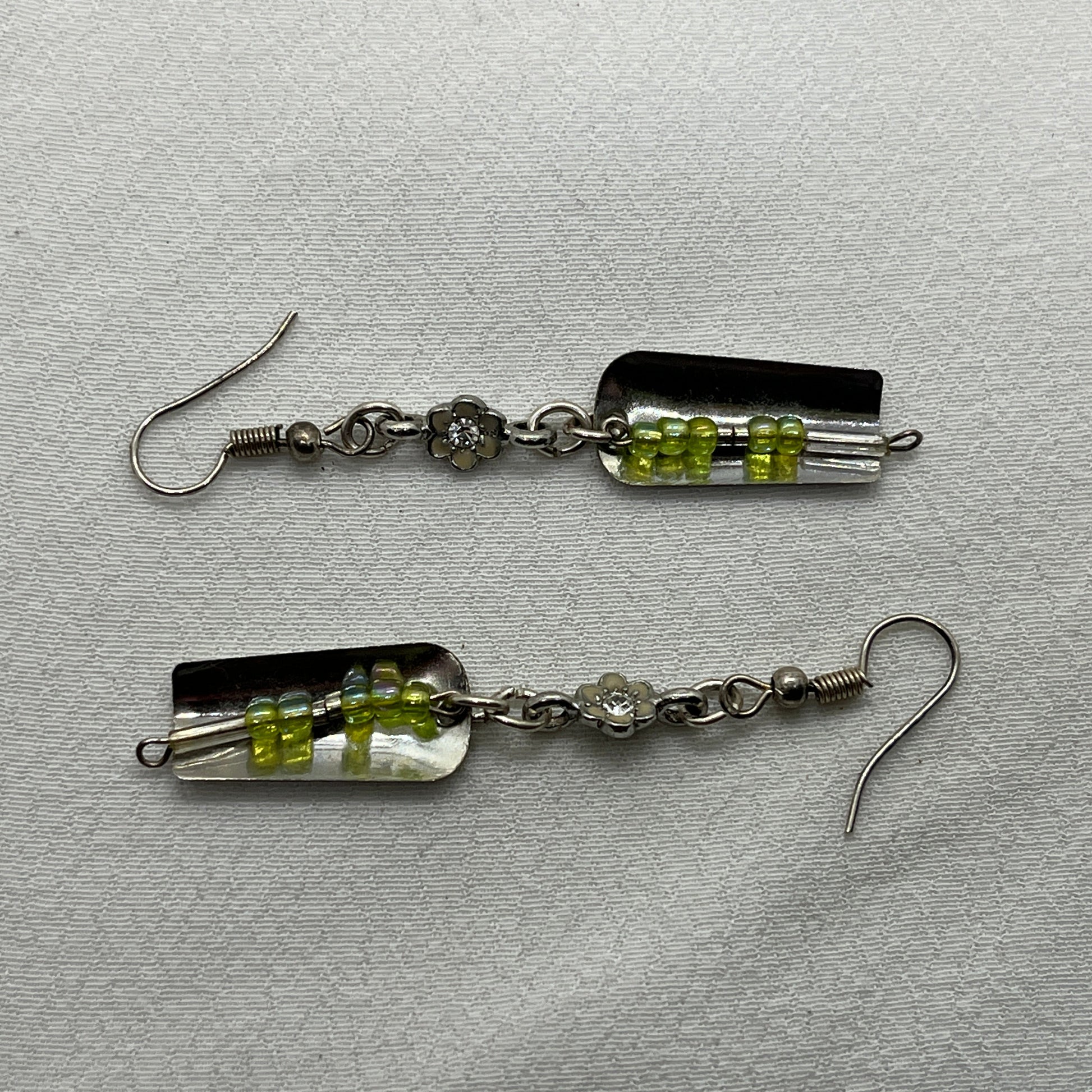 Sølv ørering med finurligt vedhæng bestående af: en fin lille sølvblomst, en buet sølvkappe hvori der sidder endnu et lille sølvvedhæng med små grønne seedbeads og sølv perler.. skønt blingeling!