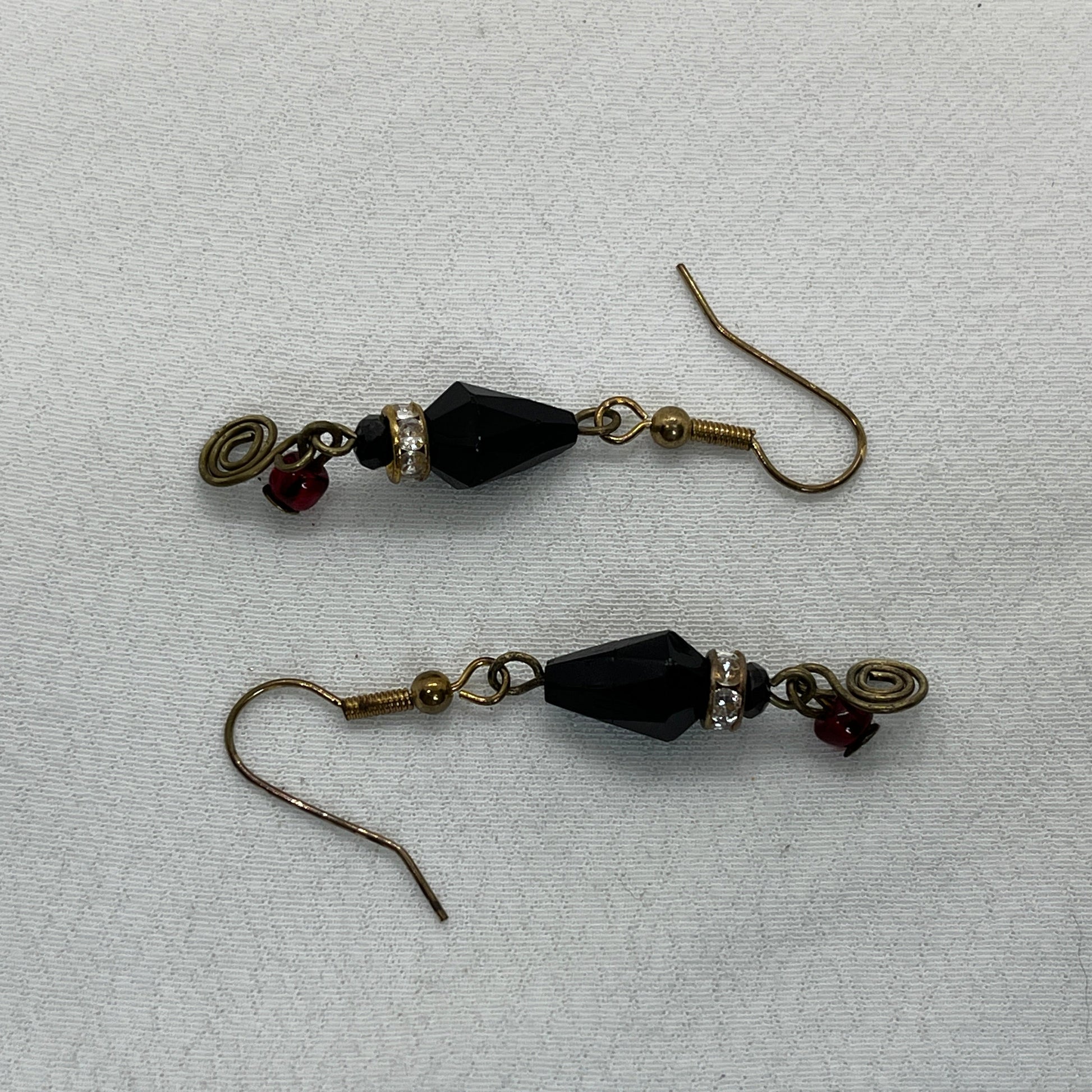 Øreringe i messing med vedhæng på messingtråd, bestående af: sort rombeformet akrylperle, messingrondel med similisten, sort og rød glasperle og afsluttet med en lille messing swirvel.