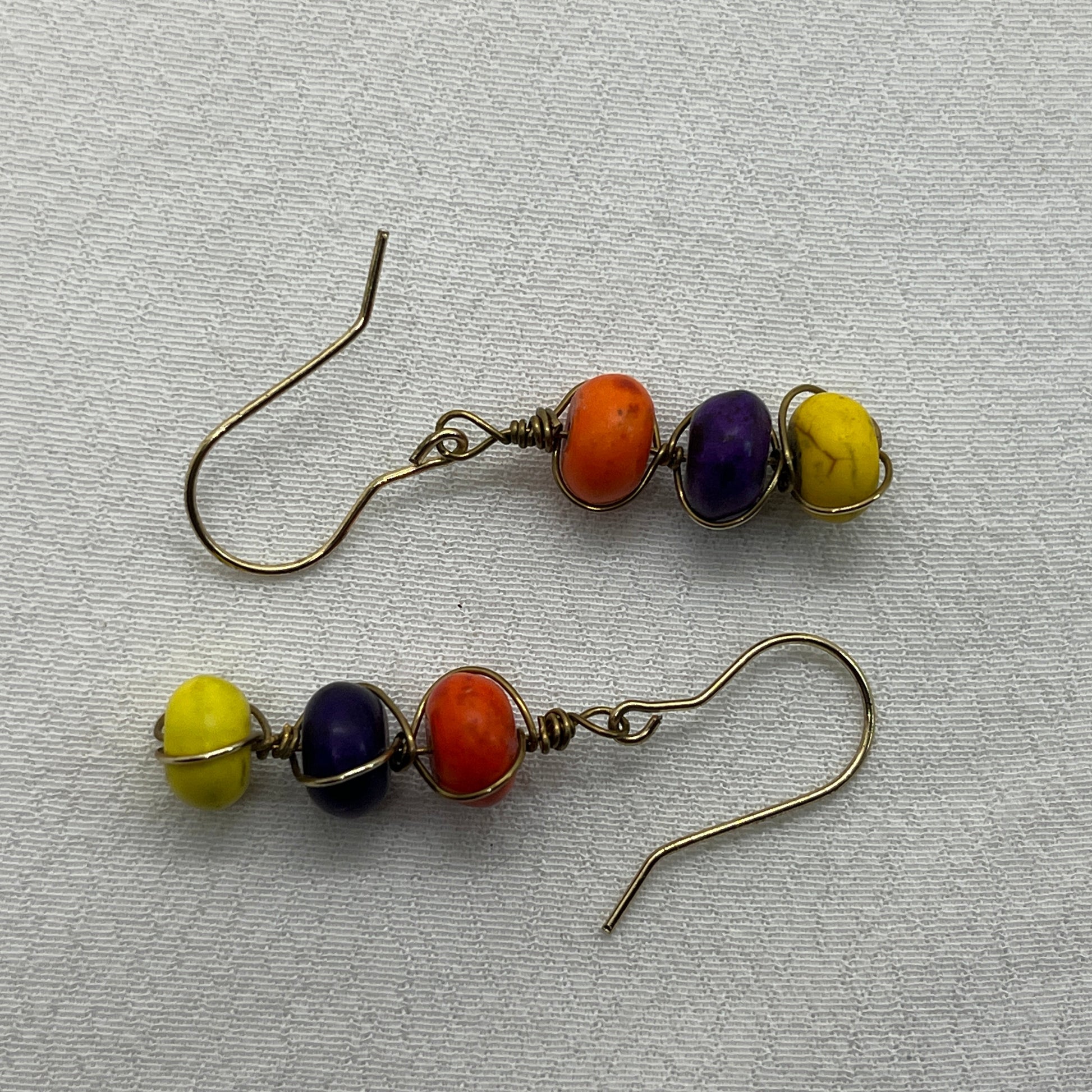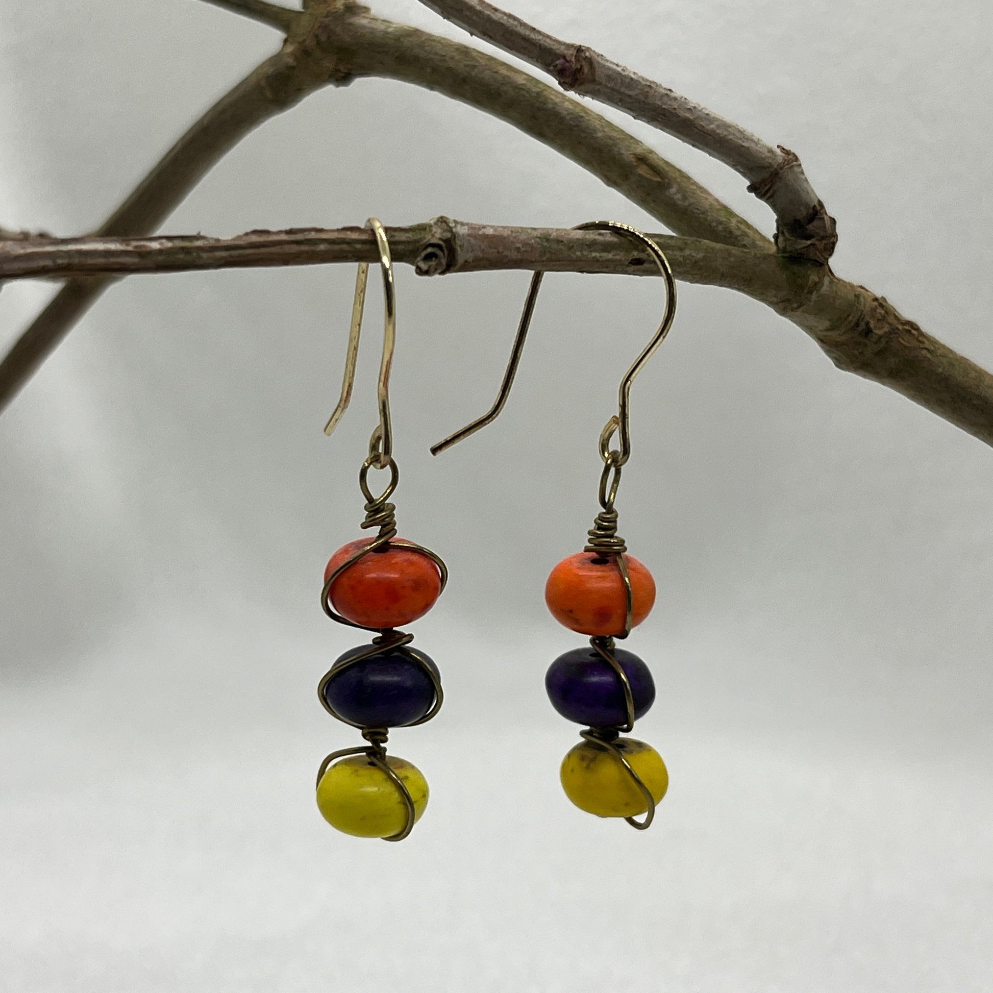 Messing øreringene har 3 keramikperler på stribe, viklet med messingtråd som trip-trap-træsko.