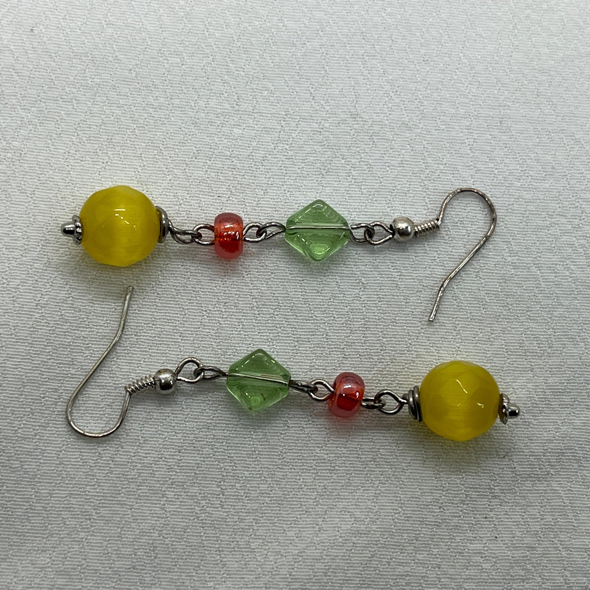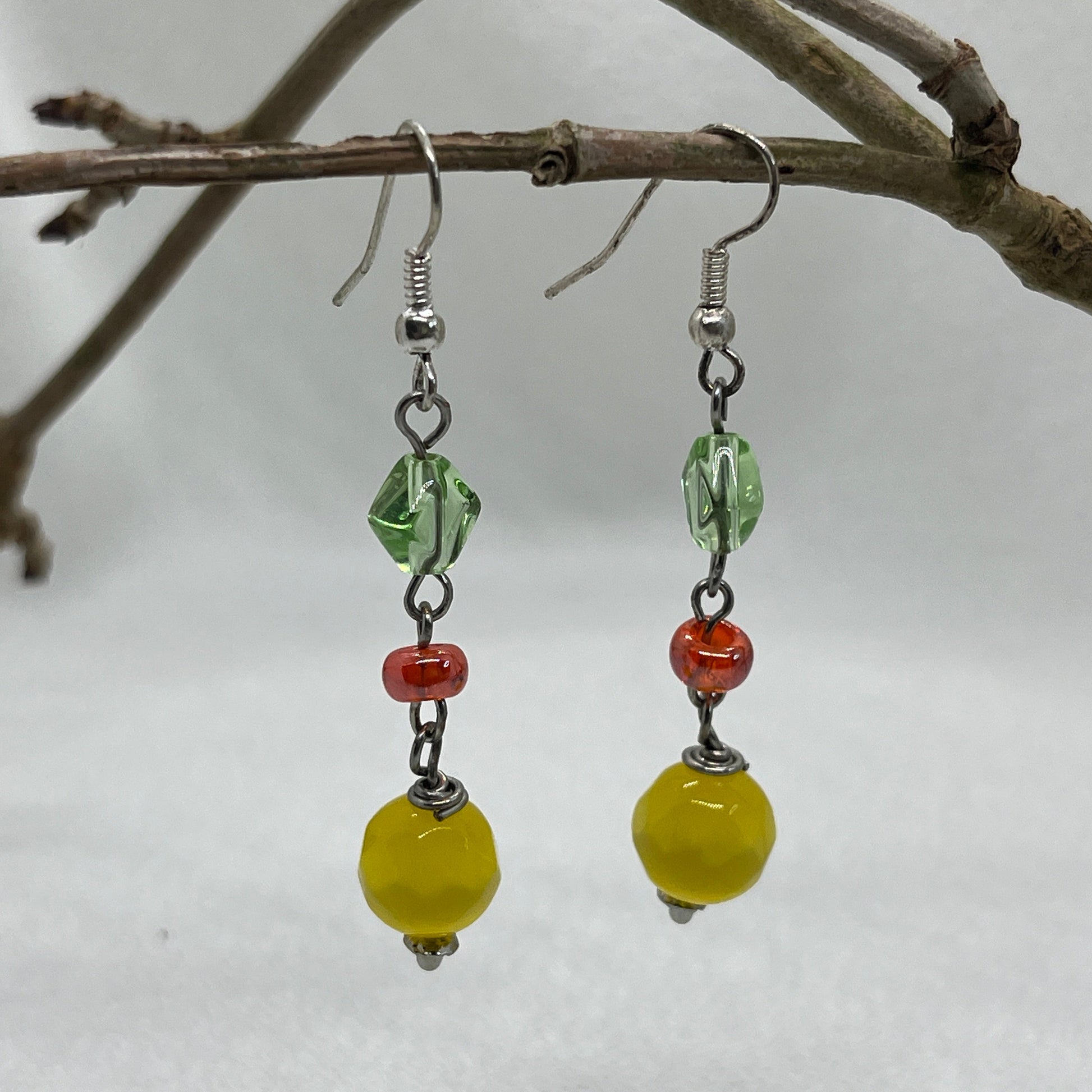 Øreringe i sølv med perler der gør dig glad i låget og gir ny energi.. sølvtråd med grøn kvadratisk glas perle og rød glasperle som afsluttes med perlestilk og en flot facetteret solskinsgul cateye sten. Positiv energi, sådan!