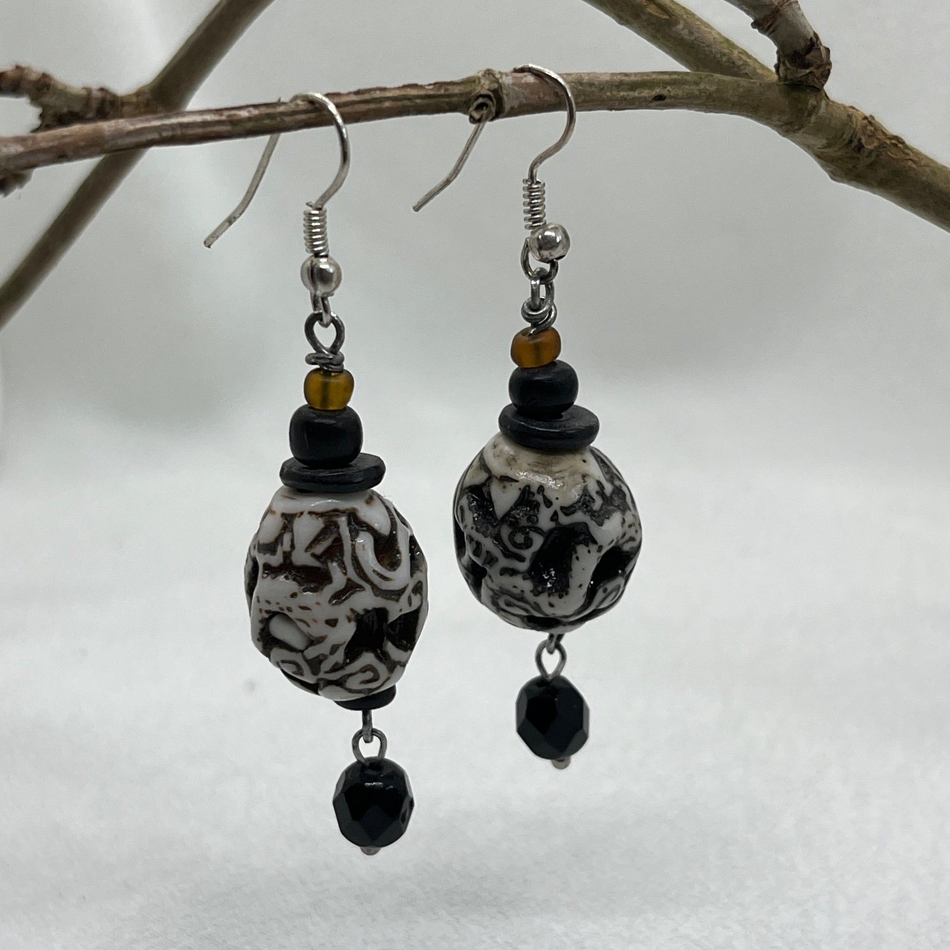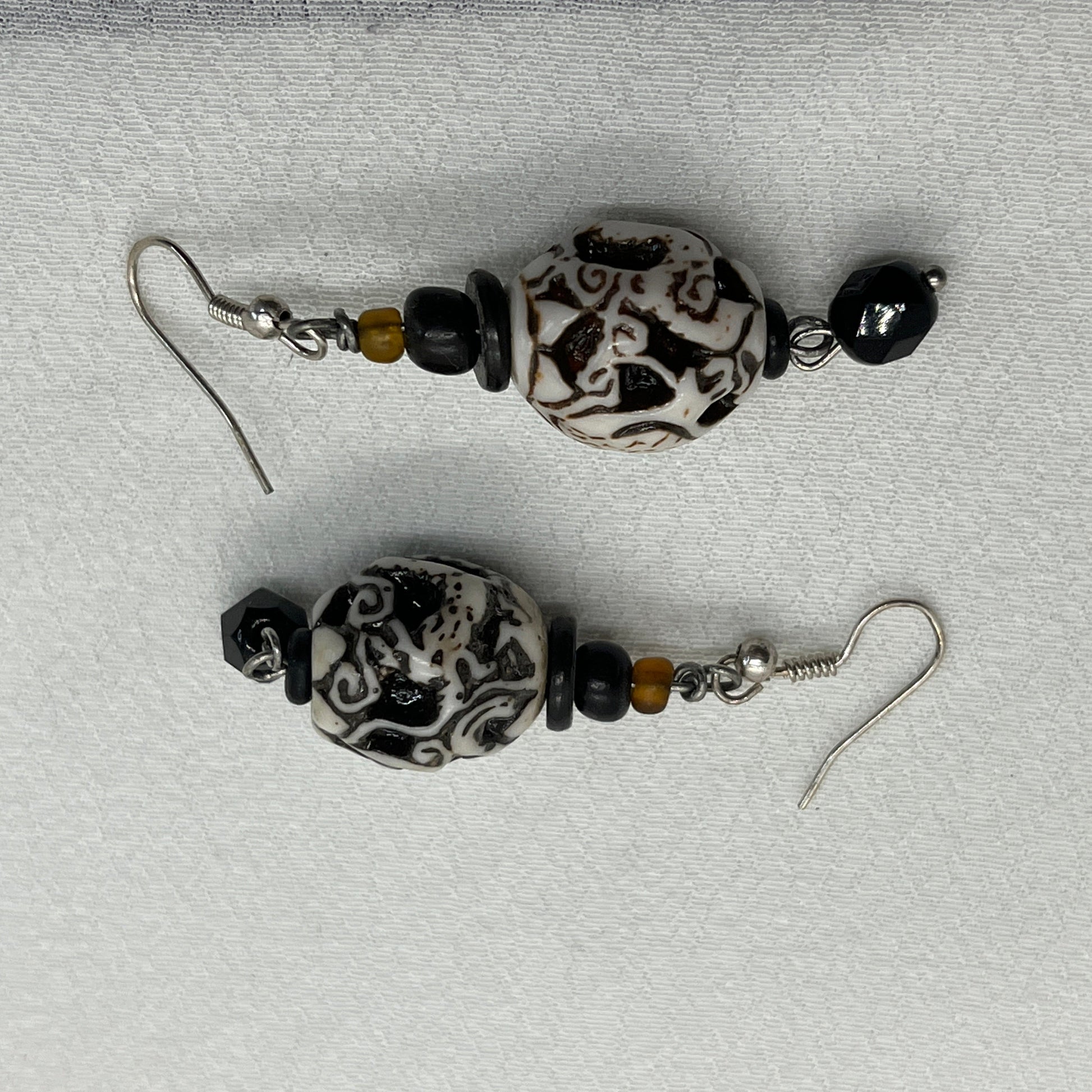 Øreringe i sølv med perle der har et mellemøstligt mønster, flankeret af sorte træperler, brune glas seedbeads og afsluttet med sølvstilk hvor der sidder en facetteret Onyx.