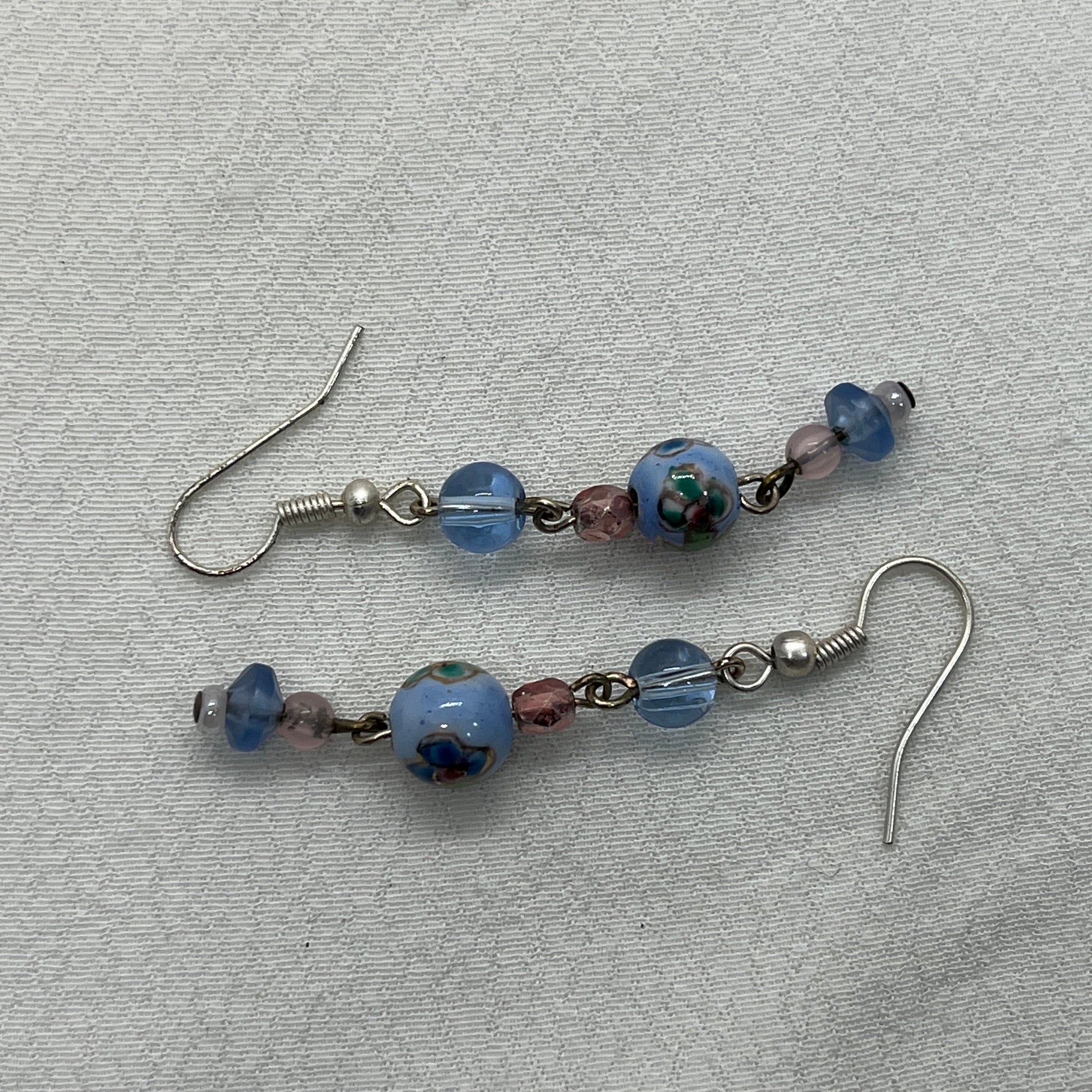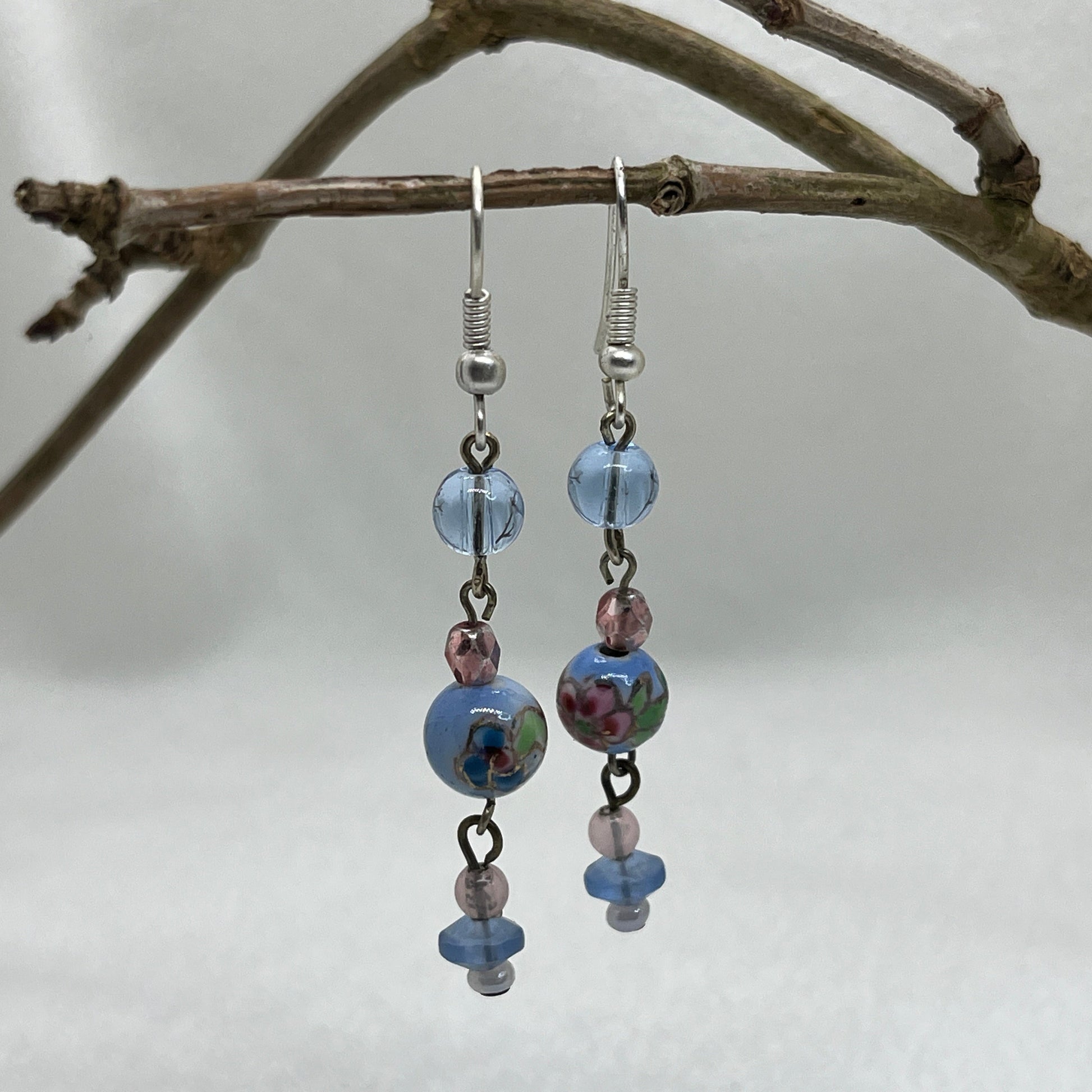 Forsølvede øreringe med vedhæng af de sødeste perler i blå og rosa douchede farver. Den blå perle i midten har et kønt blomstermotiv. Virkelig fine