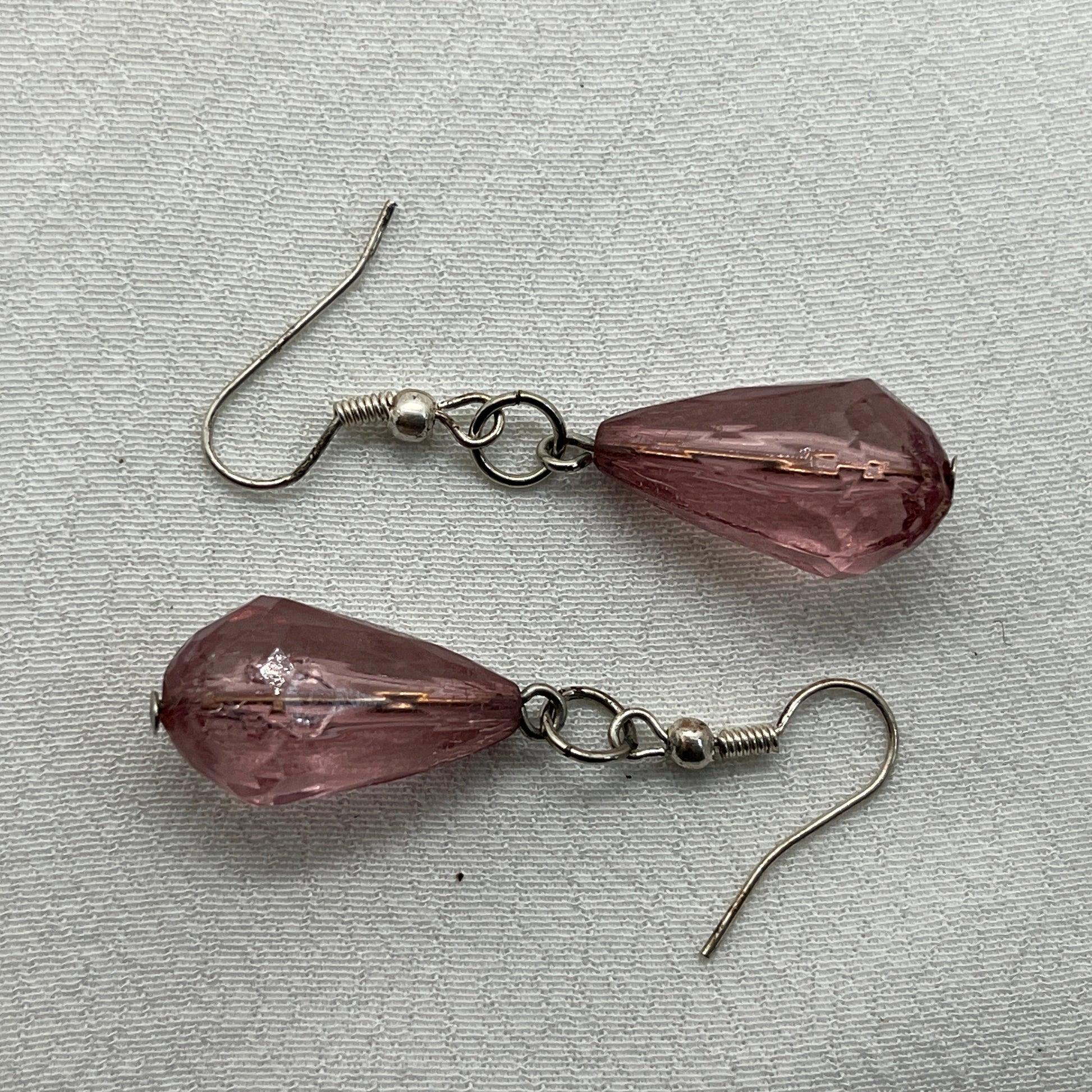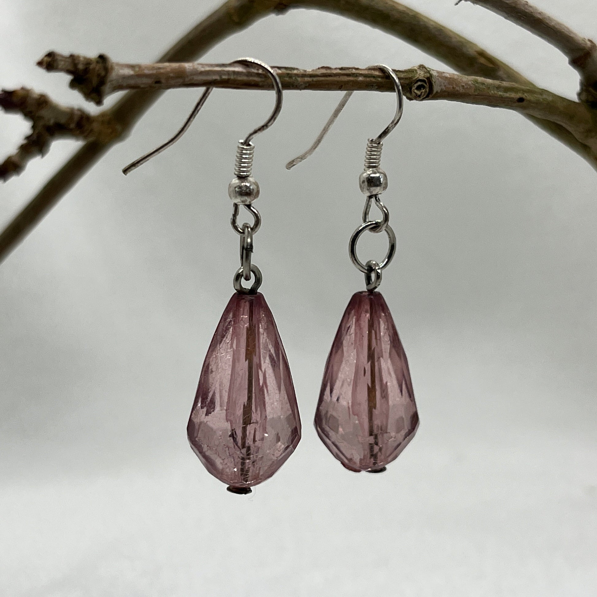 Sølv øreringe med vedhæng af en dråbeformet facetteret rosa akrylperle.