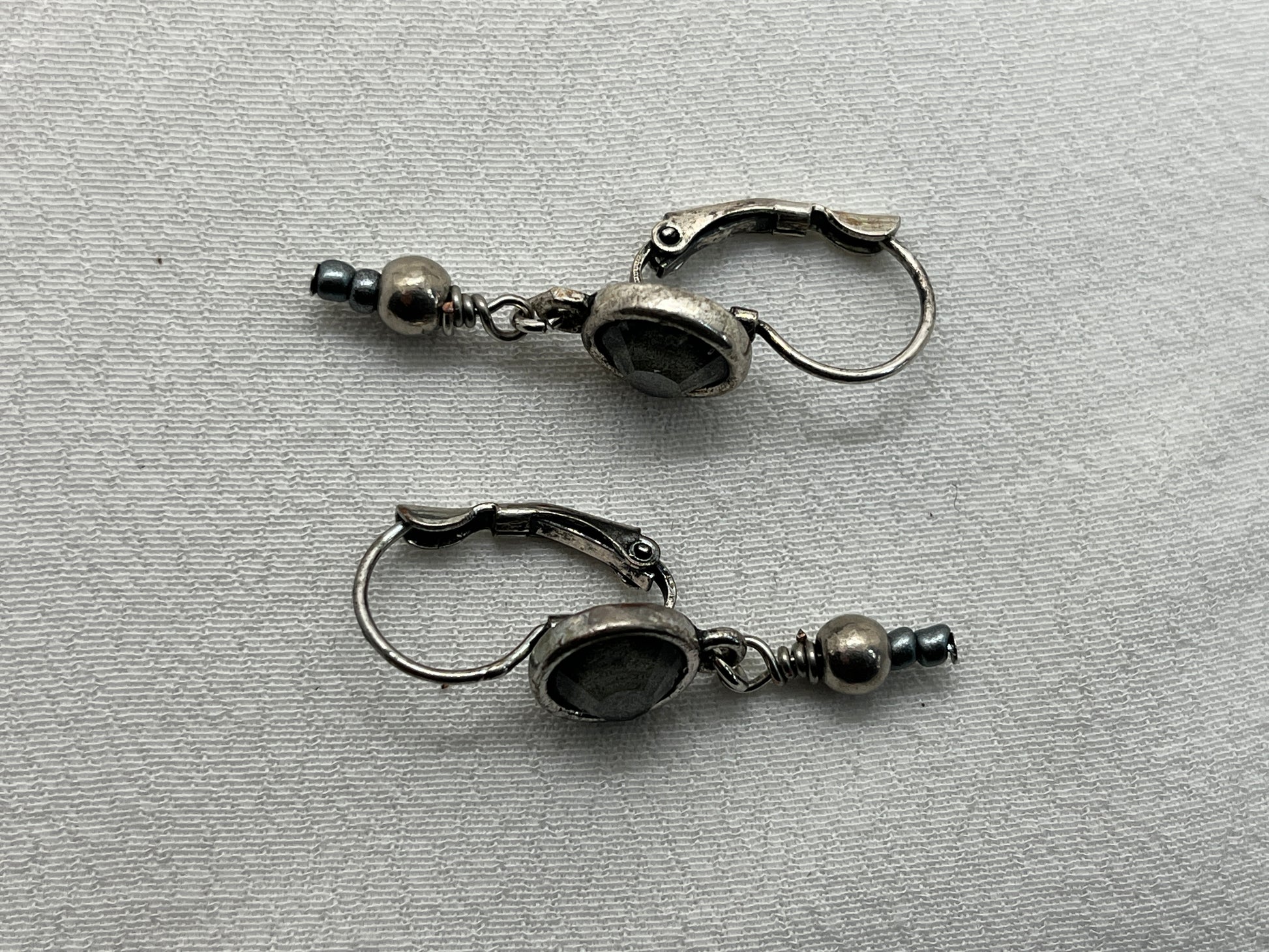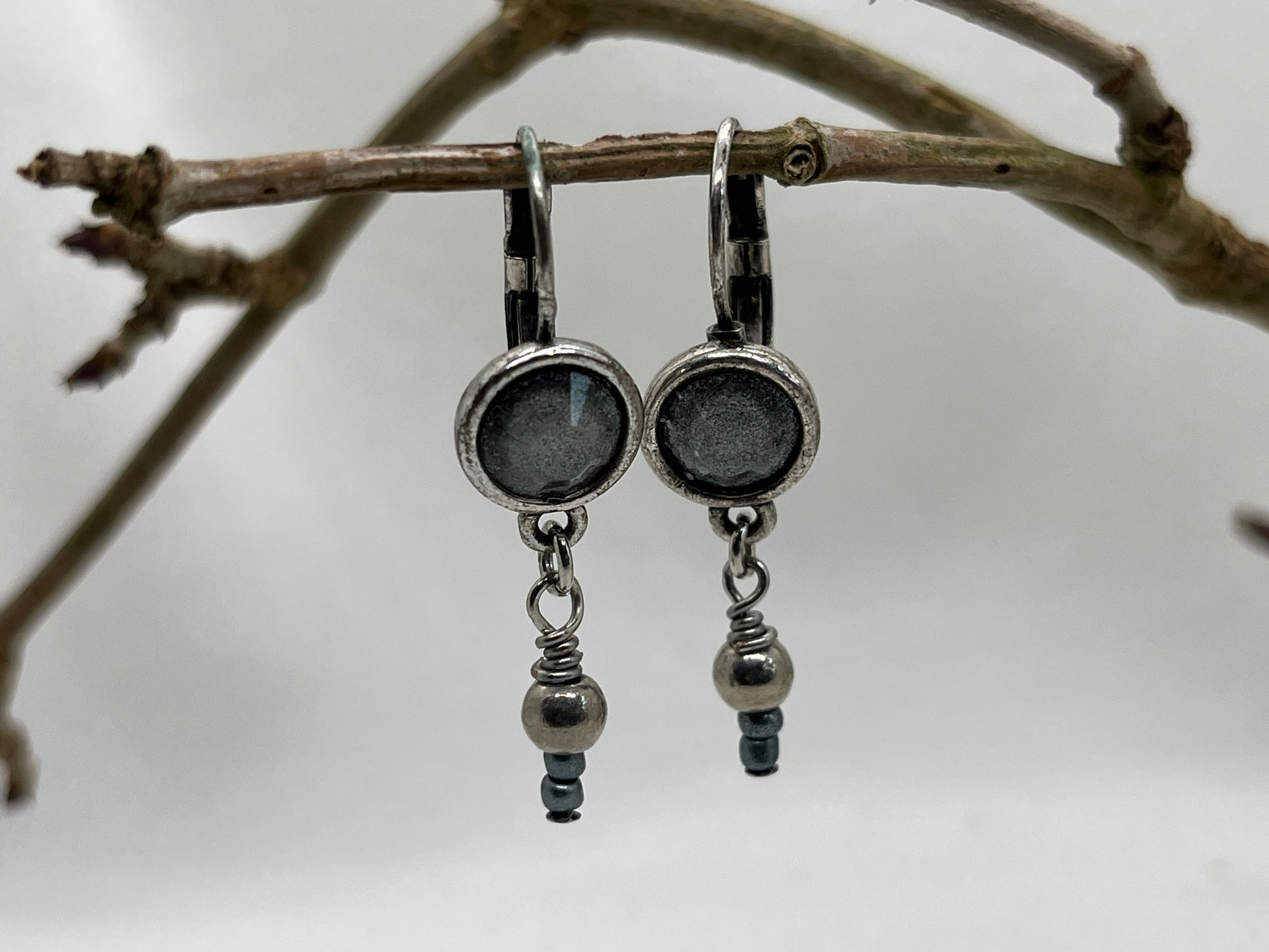 Brioche sølv ørering med en fast grå "perle" og vedhæng af metalperle og små grå seedbeads.