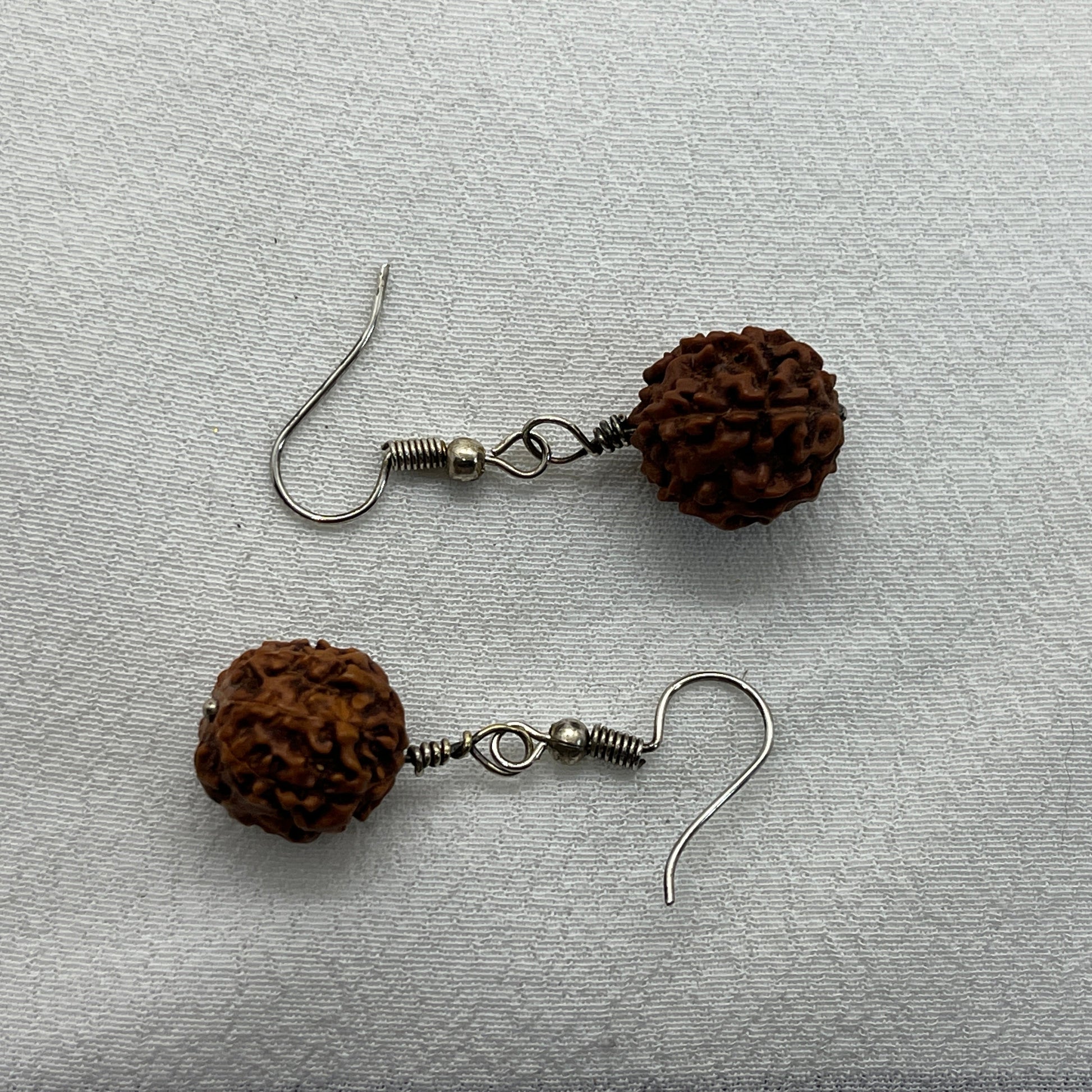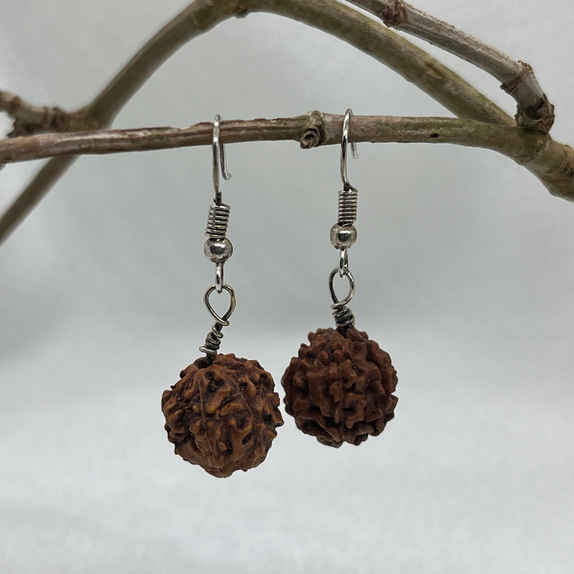 Øreringe i sølv med en flot organisk brun frøstand, der ligner lidt den danske valnød. Den er sat på en fin lille sølv perlestilk.