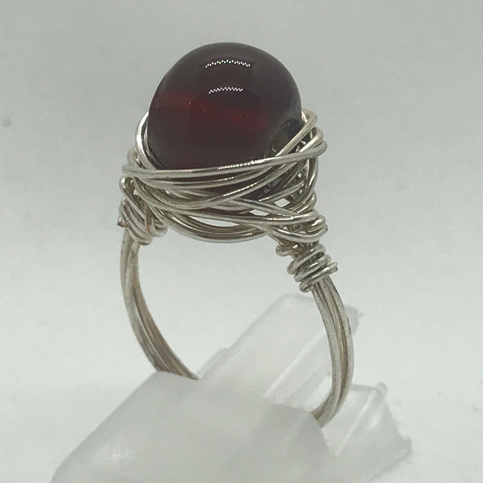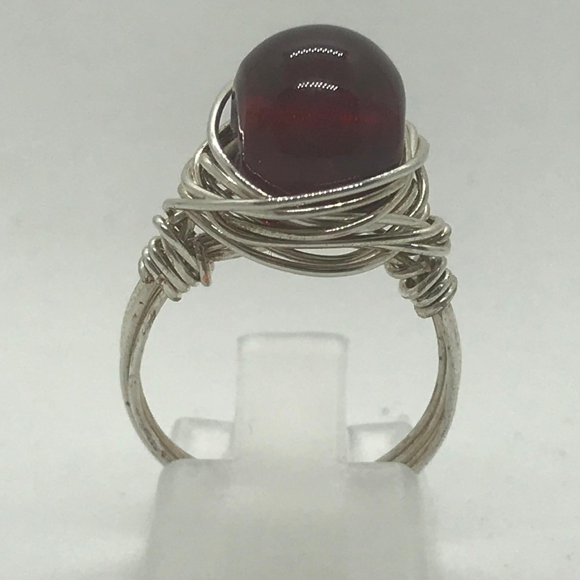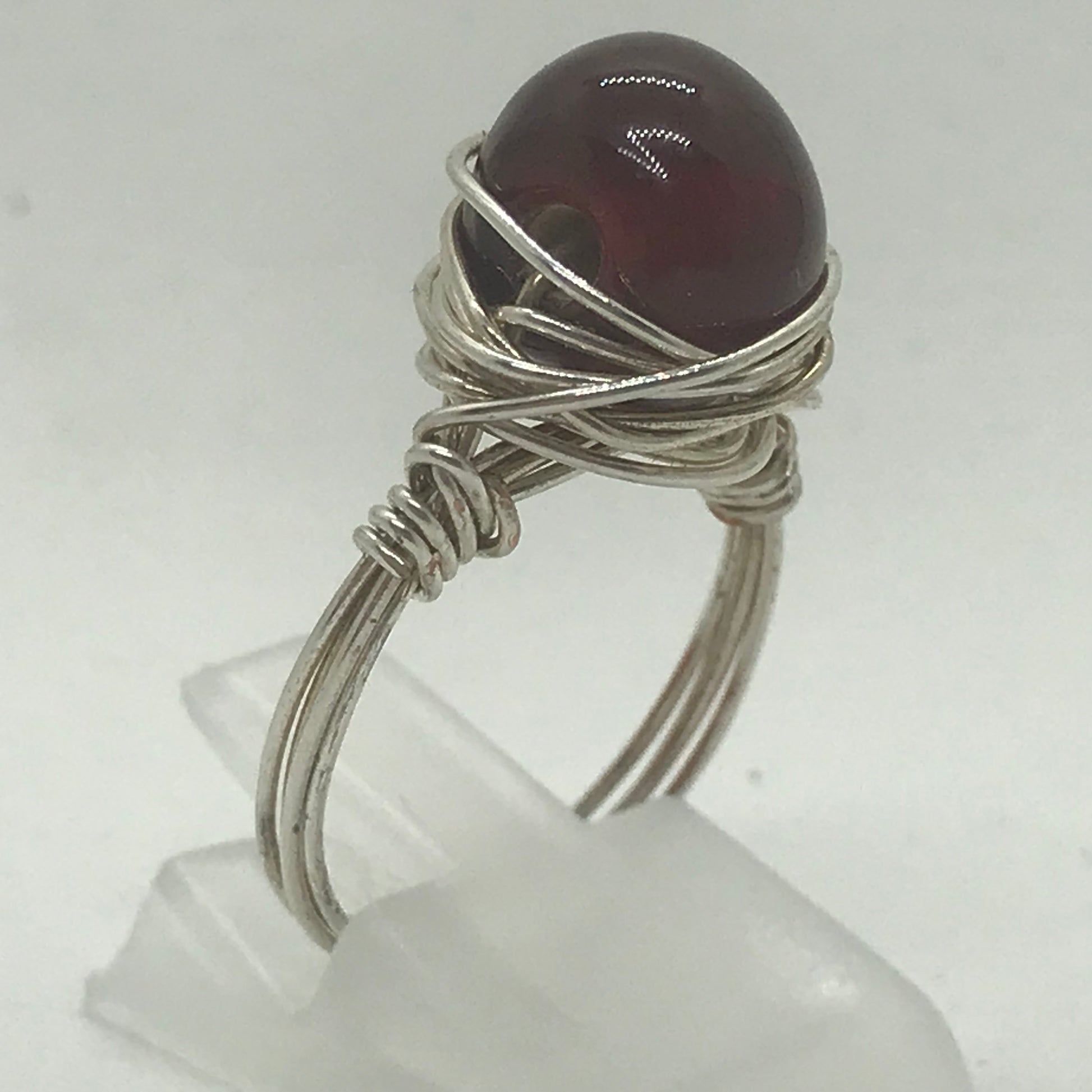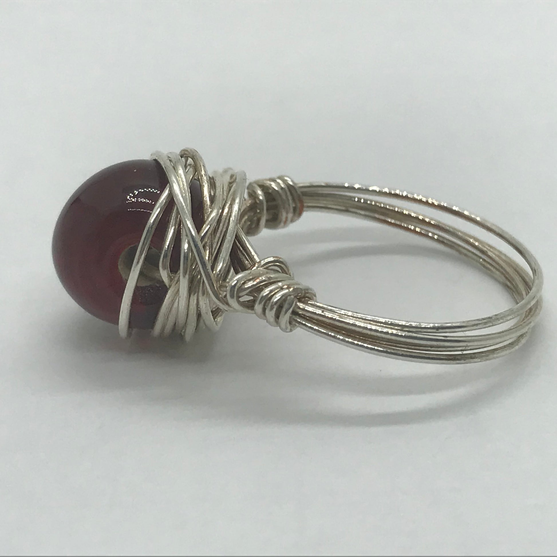 Flot ring i ægte sølvtråd. Sølvtråden er viklet mange gange rundt om en smuk klar mørk rød glasperle.