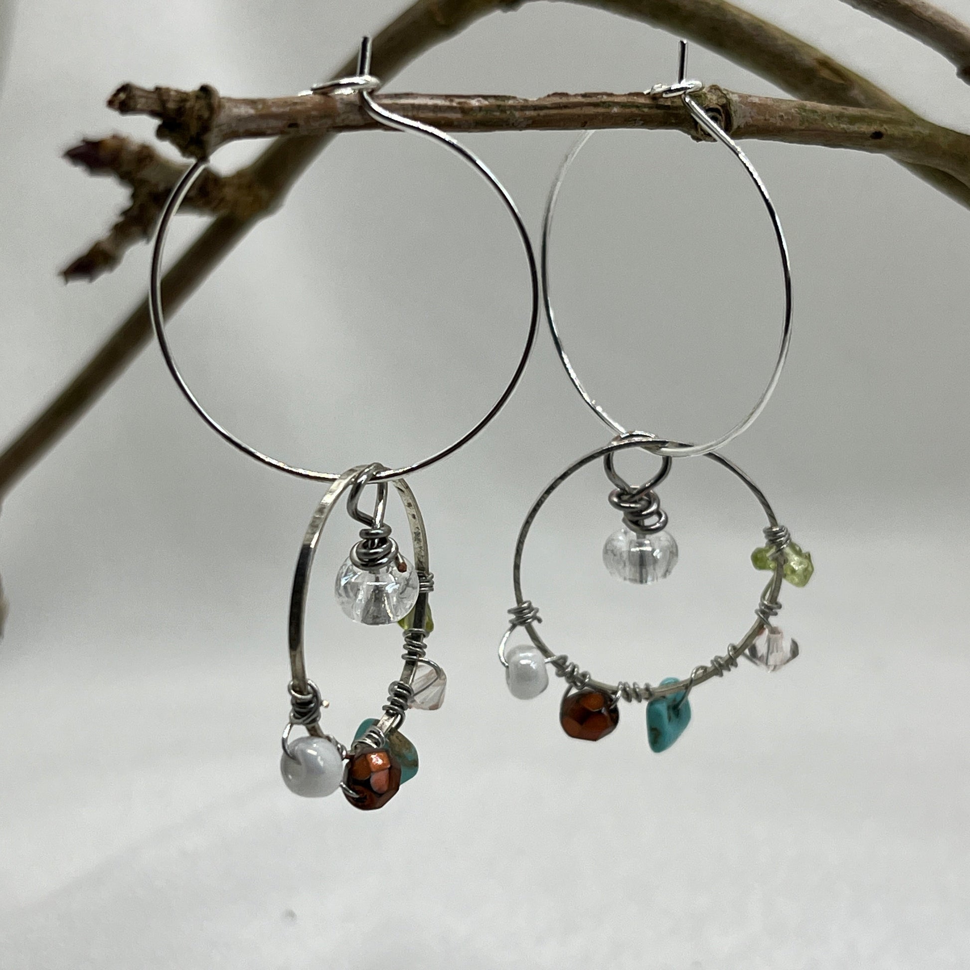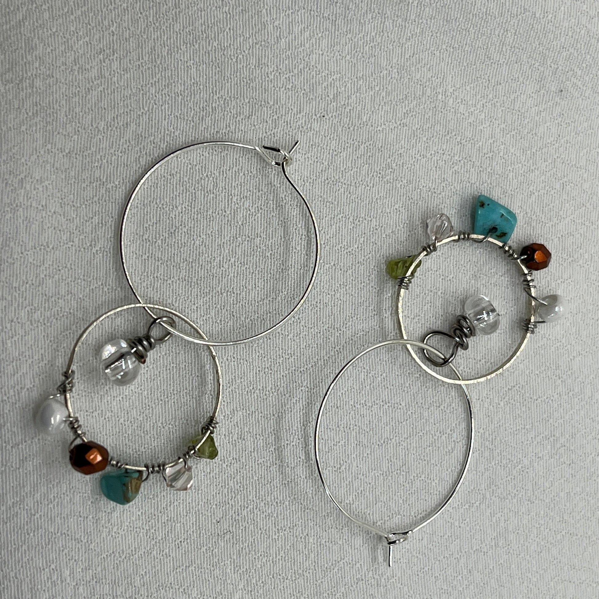 Rigtig fine creoler øreringe i ægte sølv, 2.5 i diameter. Der er et vedhæng med lille klar glasperle og en ny sølv ring med 5 små perler viklet med sølvsnor. Hvid glasperle, facetteret bronce perle, turkis, facetteret rosa cone og en lille grøn Aventurin chips.
