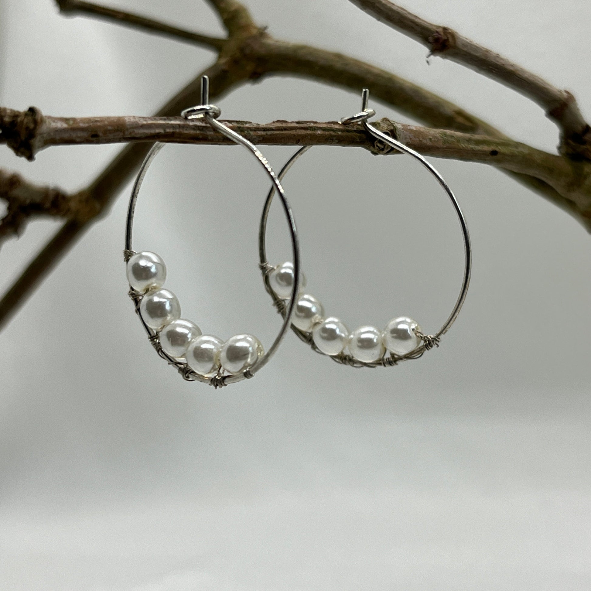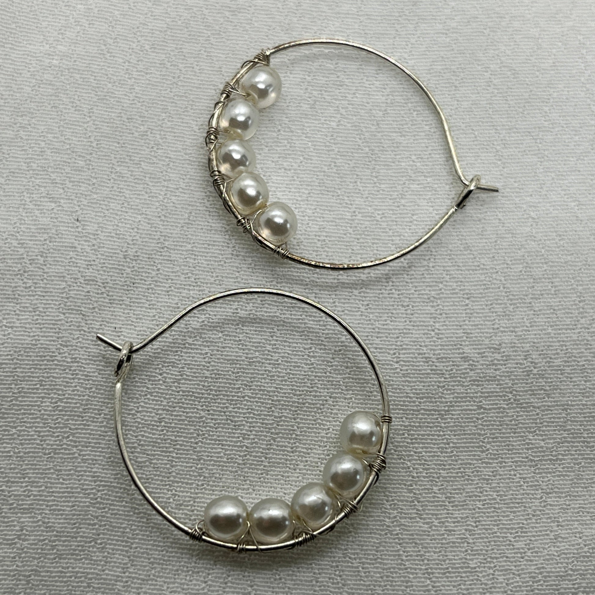 De er så fine disse 2,5 cm store creoler i ægte sølv. Der er viklet sølvtråd omkring indersiden af creolen sammen med 5 små smukke ferskvandsperler.